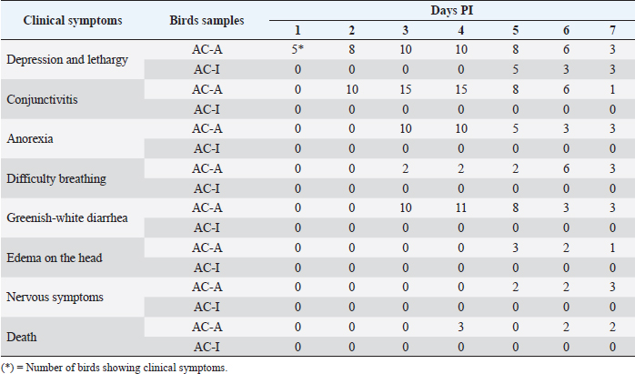 AbstractBackground: Newcastle disease is very pathogenic in chickens, whereas in ducks, the disease does not show any clinical symptoms. Aims: To compare the clinical symptoms features, pathological lesions, viral distribution, and apoptosis response caused by the Newcastle disease virus (NDV) in domestic chicken and Alabio duck. Methods: Forty domestic chickens and 40 Alabio ducks were separated into four groups: domestic chicken and Alabio duck treatment groups, where each was infected by NDV velogenic ducks/Aceh Besar_IND/2013/eoAC080721 in 106ELD50 dosage. The domestic chicken and Alabio duck control groups were each inoculated with Phosphate Buffer Saline. The infection route was intraorbital, 0.1 ml in volume. Symptoms were observed from day 1 until day 7 post-infection (PI). Necropsy was performed on days 1, 2, 3, 5, and 7 PI for organ collection. Results: Symptoms observed were disorders in the respiratory, gastrointestinal, and nervous systems, followed by 100% mortality in domestic chickens. In Alabio ducks, there were only depression and slight lethargy. The lesion in domestic chicken day 1 appeared by the lungs, thymus, Fabricius bursa, spleen, and kidney. On day 3 PI, lesions were also found in the heart, proventriculus, duodenum, and cecal tonsil. On days 5 and 7 PI, the trachea and brain lesions were found. In Alabio ducks, lesions were found in the lungs, thymus, spleen, and proventriculus on day 1. Afterward, on day 3, light lesions were found in the heart. On day 5, lesions were found in the trachea and brain; finally, on day 7, light lesions were only found in the thymus, spleen, and brain. Immunopositive reaction NDV in domestic chicken was highest in the proventriculus, duodenum, cecal tonsil, and lymphoreticular organs. In the Alabio duck, it was highest in the duodenum and cecal tonsil. The caspase-3 percentage in domestic chicken increased on day 3 PI; in Alabio ducks, on day 2 PI. Conclusion: Clinical symptoms and pathological lesions were faster and more severe in domestic chickens. The immunopositive reaction NDV in domestic chicken continued to increase, while in Alabio ducks, it decreased until the last observation day. Apoptosis percentage increased earlier in the Alabio duck than in domestic chicken. Keywords: Apoptosis, Caspase-3, Immunohistochemistry, Pathology, Newcastle disease. IntroductionNewcastle disease (ND) is highly pathogenic in reared chicken but less pathogenic in other birds that are important in spreading the Newcastle disease virus (NDV). It has high morbidity and mortality and can spread rapidly (OIE, 2021). NDV has widely infected bird species, such as chickens, ducks, geese, pigeons, parrots, and several other birds (Zhang et al., 2011). Ducks and geese act as a natural reservoir that does not show clinical symptoms but can transmit the deadly disease to chickens (Alexander and Senne, 2008). Dai et al. (2014) compared six breeds of ducks and found mallard ducks were the most susceptible and Pekin ducks were the more resistant; they found that the susceptibility of ducks to NDV decreased with age, and most deaths occurred between 15 and 30 days of age. Kencana et al. (2012) reported that 10 domestic chicken samples collected from field cases in 2008–2009 in Bali, Indonesia, were positive to be infected by the acute NDV. NDV infection in domestic chicken, broiler chicken, and waterfowl in Aceh, Indonesia, is dominated by virulent strains (Darniati et al., 2015; Daud et al., 2019). In addition, several pathogenic isolates have been isolated from reared ducks (Liu et al., 2010; Zhang et al., 2011; Panus et al., 2015). ND can cause damage to lymphoid tissue and macrophages. Previous studies reported that histopathologically ND causes lymphoid follicular depletion, necrosis, and apoptosis in the caecal tonsil, thymus, and bursa of Fabricius and spleen chicken (Nakamura et al., 2008; Anis et al., 2013; Etriwati et al., 2017a). Skeletal muscle congestion, mild intestinal erosion, and mild hemorrhagic cecal tonsils in ducks (Eze et al., 2014). Apoptosis is a significant factor in viral pathogenesis, especially in the mechanism of clearance virus by the immune system (Myers et al., 2012). NDV causes apoptosis in the spleen of domestic chickens (Kommers et al., 2002), chicken embryo fibroblast cells (Ravindra et al., 2009), and chicken macrophages (Lam, 1996). There are many things yet unknown on the cause of why ducks are more resistant to ND disease compared to chickens. Therefore, this study was designed to compare the clinical symptoms features, pathological lesions, viral distribution, and apoptosis response due to NDV in domestic chickens and Alabio ducks. Materials and MethodsResearch procedureOne-day-old domestic chickens (Gallus gallus domesticus) and 1-day-old Alabio duck (Anas platyrhynchos Borneo) were reared until 6 weeks in semi-isolated cages in groups. Feed and drinking water were provided ad libitum. The treatment groups are: AC-A (Domestic chicken group, n =20) and AC-I (Alabio duck group, n=20), were infected by NDV velogenic isolate Ducks/Aceh Besar_IND/2013/eoAC080721 under 106ELD50 dosage. The K-A (Domestic chicken control group, n=20) and K-I (Alabio duck control group, n=20) were inoculated by PBS. All inoculations were performed via intraorbital as much as 0.1 ml. Before being infected by NDV, the domestic chickens and Alabio ducks tested negative for NDV antibody by hemaglutinin inhibition test. Clinical symptoms and gross anatomy observationClinical symptoms were observed from day 1 until day 7 post-infection (PI). Three individuals from each group were necropsied on days 1, 2, 3, 5, and 7 PI. Gross pathological changes in the proventriculus, duodenum, ceca tonsil, trachea, lung, heart, thymus, Fabricius bursa, spleen, kidney, and brain were observed. All organ samples were cut into 1 × 1 × 0.5 cm sizes and fixed in neutral buffered formalin 10% for a minimum of 24 hours to be made into histopathology preparations in 