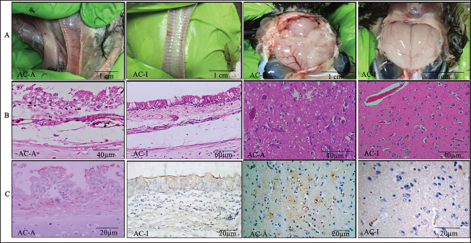 Fig. 2. Trachea and brain on the 5th-day pi. (A). Anatomical pathology; (B). Histopathology; (C). Immunohistochemistry; AC-A (Domestic chicken) and AC-I (Alabio ducks). Infected with isolate ducks/Aceh Besar_IND/2013/eoAC080721. Histopathology with hematoxylin and eosin. Immunohistochemical using anti-NDV antibody On all observation days, the Thymus of domestic chicken appeared to have half of its lobes atrophied and had petechiae/hemorrhage. In contrast, in Alabio ducks, part of the lobus showed petechiae on all observation days. The spleen of domestic chickens on days 1, 3, and 5 PI showed congestion, swelling, and multifocal necrosis, while the days after were followed by atrophy. In Alabio ducks, the spleen showed swelling and multifocal necrosis only during day 3 PI. The Fabricius bursa of domestic chicken on day 1 PI appeared to be swelling with focal hemorrhage. On the rest of the observation days, it was followed by atrophy and diffuse hemorrhage, whereas in Alabio ducks, no lesion was found on all observation days. Starting from day 3 PI, the domestic chicken heart showed swelling, while the Alabio duck heart showed no gross pathology changes on every observation day. Domestic chicken kidneys on all observation days appeared swelled with multifocal paleness, while in Alabio ducks, no lesion was seen on any observation day. Domestic chicken brain from day 5 PI started to show edema and multifocal congestion, while in Alabio duck, the lesion was focal (Fig. 2A) Histopathology examinationThe control domestic chicken and Alabio duck group showed no histopathology lesions. Domestic chicken proventriculus on day 1 PI showed congestion, focal mononuclear proliferation on the mucosal layer, necrosis, and focal epithelial cell desquamation on proventriculus glands. On day 3 PI, the lesions spread in a multifocal pattern; on days 5 (Fig. 1B) and 7 PI epithelial cells showed necrosis and diffuse hemorrhage by the muscle layer and multifocal epithelial cell desquamation as well as necrosis, congestion, and multifocal mononuclear cell infiltration by the proventiculus gland. Alabio duck proventriculus on day 1 PI showed focal epithelial cell desquamation; on days 3 and 5 PI showed congestion, epithelial cell desquamation, and multifocal mononuclear cell proliferation, while proventriculus glands showed multifocal necrosis, epithelial cell desquamation, and focal congestion. On day 7 PI, no lesion was seen by the proventriculus. On days 1 and 3 PI, domestic chicken duodenum showed hemorrhage, congestion, and focal crypt epithelial cell necrosis. On all following observation days, multifocal hemorrhage with intestine villus desquamation, diffuse crypt epithelial cell necrosis, and multifocal proliferation of crypt epithelial cells in lamina propia was observed. Alabio duck duodenum from days 3 to 5 PI showed multifocal crypt epithelial necrosis, congestion, hemorrhage, and focal goblet cell proliferation. On day 7 PI, there were multifocal crypt epithelial cell necrosis and focal mononuclear cell proliferation in lamina propria. The cecal tonsil of domestic chicken on all observation days histopathologically showed congestion, hemorrhage, necrosis (karyopicnosis) of crypt epithelial cells, mononuclear cell proliferation on the lamina propria, and lymphocyte cell depletion inside the lymphoid follicle, which spread in the multifocal pattern. The Alabio duck cecal tonsil on days 1 and 3 PI showed congestion, necrosis (Karyopicnosis) of crypt cells, and multifocal mononuclear cell proliferation by the lamina propria. On days 5 and 7, multifocal mononuclear cell proliferation in lamina propria and depletion of lymphocyte cells in lymphoid follicles were seen (Fig. 1B). Domestic chicken trachea on day 1 PI showed congestion, epithelial cell desquamation, focal inflammatory cell infiltration, and diffuse edema. On the following observation days, the lesions spread in multifocal patterns. Alabio duck trachea on all observation days showed congestion, epithelial desquamation, focal inflammatory cell infiltration, goblet cell proliferation, and diffuse edema (Fig. 2B). Domestic chicken lung on day 1 PI showed hemorrhage, congestion, edema, and multifocal mononuclear cell proliferation. On all following observation days, the lesion spread in a diffuse pattern. Alabio duck lungs on all observation days showed congestion, edema, hemorrhage, and multifocal mononuclear cell proliferation. The domestic chicken's thymus, Fabricius bursa, and spleen on days 1 and 3 PI showed lymphoid depletion, congestion, and multifocal vasculitis. On days 5 and 7, the lesion spread in a diffuse pattern accompanied by cyst formation, lysing cells, and part of the tissue being replaced by connective tissue. The ducks' Thymus, Fabricius bursae, and spleen on day 1 appeared to suffer lymphoid depletion, congestion, and focal vasculitis. On days 3 and 5 PI, the lesions were spread in a multifocal pattern, and on day 7, the lesions were spread in a focal pattern. The heart of domestic chicken on day 3 PI started to show edema and focal degeneration; on day 5 PI, it was accompanied by hemorrhage, congestion, and focal mononuclear cell infiltration. On day 7, the lesions spread in a multifocal pattern accompanied by pericarditis and endothelial hypertrophy. However, in Alabio duck, the lesions were only spread in a focal pattern without pericarditis. The kidney of domestic chicken on day 1 PI appeared to suffer from edema, congestion, and focal hemorrhage. On day 3 PI, the lesions were spread in a multifocal pattern. Every following observation day, the lesions spread diffusely, followed by multifocal mononuclear cell infiltration by the interstitial area of the kidney. Alabio duck kidney appeared to suffer from edema and focal congestion on all observation days, and focal mononuclear infiltration by kidney interstitial started to appear from day 3 PI. Domestic chicken brain on days 1 and 3 PI showed neuron degeneration, congestion,