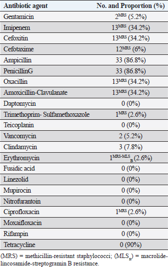 Table 2. Antimicrobial susceptibility profiling and phenotypes of staphylococci as identified by the Phoenix Automated Identification System (n=38).