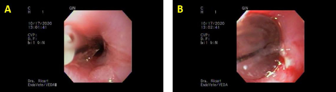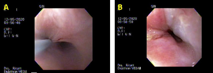 Fig. 3. Third day of endoluminal dilatation and second triamcinolone injection. (A) First quadrant injection in the submucosa with a per-endoscopic needle, 0.3 ml of triamcinolone acetate 40 mg/ml. (B) Evaluation of the endoluminal procedure after the four-quadrant injection. DiscussionThis case report describes successful therapy of recurrent esophageal strictures by combined endoscopic balloon dilatations in a cat local submucosal triamcinolone acetate injections that failed to respond to three balloon dilatations alone. In this clinical case, balloon dilatation was the therapeutic option, thus the stricture was annular; in other cases presenting long strictures, Savary–Gilliard dilatation is the better therapeutical option, and they need more dilatation sessions (Novais et al., 2008). Intralesional steroid injections have been suggested to inhibit the inflammatory response, thereby the stricture formation (Siersema, 2019). There were no differences in response outcomes between injections ranging from 0.5 to 2.8 ml of triamcinolone acetate or acetonide 10 or 40 mg/ml in human medicine Poincloux et al., 2017 In veterinary medicine, as to the authors’ knowledge, there are no specific guidelines with regard to the injection dose. The dose in this clinical case (triamcinolone acetate 40 mg/ml 0.3 ml in each quadrant) was chosen empirically. This is the range used in human medicine. The cat did not develop any complications associated with the high dose of corticosteroids. Double-blinded prospective studies are necessary to evaluate the range of dose for cats and dogs and guidelines for its use. Systemic corticosteroids have questionable efficacy in the prevention of esophageal strictures in human beings and dogs (Poincloux et al., 2017). It may be argued that a successful outcome in this clinical case might have been achieved with a fourth or fifth balloon dilatation procedure alone without the corticosteroid injections. There are reports of successful outcomes achieved in 88% of canines and felines with endoscopic balloon dilatation with a range of one to five procedures (Fraune et al., 2009). In another retrospective study of canine and feline animals suffering from esophageal strictures, despite one to four balloon dilation procedures (mean=3), stenosis recurred and subsequent esophageal stenting was chosen as an alternative therapeutic procedure. This article mentions that this procedure was performed in five dogs and in three cats; in these seven animals the stenting was successful; however, three had mild and three of them had severe discomfort evaluated as poor tolerance, ptyalism, persistence of occasional regurgitations, or needed progressive stent removal and replacement. In the three cats, trichobezoar caught was observed (Da Riz et al., 2021). It should be taken into account that the European Society of Gastrointestinal Endoscopy does not recommend permanent stent placement in humans for refractory benign stricture; stents should usually be removed at a maximum of 3 months following insertion (Spaander et al., 2021). The frequency at which the procedures were performed was not possible to control; unfortunately, the indication of repeating the procedure every 4–7 days was not a possibility in this clinical case. The third dilatation was delayed for 30 days because of owners’ personal reasons. As the American Heart Association and the American Society of Gastrointestinal Endoscopy do not recommend routine antibiotic coverage prophylaxis in human medicine, even if bacteremia is the most common complication that occurs in 2%–23% of the cases (Poincloux et al., 2017), it was decided not to give amoxicillin/clavulanic acid or other broad-spectrum antibiotics as other clinical reports in dogs or cats had empirically decided before (Corgozinho et al., 2009; Fraune et al., 2009; Poincloux et al., 2017). The cat showed no clinical signs of bacteremia as a consequence of the dilatation procedures in either session. The use of routine antibiotic coverage prophylaxis in dogs and cats should be reconsidered because of its concern for increased antimicrobial resistance and long-term changes in microbiota composition (Ziese and Suchodolski, 2021). ConclusionThe alternative to triamcinolone injection after balloon dilatation presented in this clinical report was successful and it could be a therapeutic option for recurrent esophageal strictures in cats as it is in human medicine. The clinical signs of strictures depend on the degree of obstruction; most of the time there is a gradual progression as the stricture continues to contract, with more pronounced regurgitation and dysphagia; clinicians should take into account this differential diagnosis. AcknowledgmentThe authors would like to acknowledge the authorization from the family of the cat for the publication of the case report. Authors’ contributionsMCR: case evaluation, endoscopic management, manuscript drafting, and approval of the final manuscript; SMR: case evaluation, anesthesia administration and monitoring, critical revisions, and approval of the final manuscript; GD: endoscopic guidance, critical revisions, and approval of the final manuscript. Conflicts of interestAll authors declare that there are no conflicts of interest. ReferencesCorgozinho, K.B., Neves, A., Belchior, C., Toledo, F., Moreira de Souza, H.J. and da Hora, A.S. 2009. Uso de triancinolona local em uma gata com estenose esofágica. Acta Sci. Vet. 34, 175–178. Da Riz, F., Béguin, J., Manassero, M., Faucher, M. and Freiche, V. 2021. Outcome of dogs and cats with benign oesophageal strictures after balloon dilatation or stenting: 27 cases (2002–2019). J. Small Anim. Pract. 62(10), 886–894. Fraune, C., Gaschen, F. and Ryan, K. 2009. Intralesional corticosteroid injection in addition to endoscopic balloon dilation in a dog with benign oesophageal strictures. J. Small Anim. Pract. 50, 550–553. German, A.J., Cannon, M.J., Dye, C., Booth, M.J., Pearson,