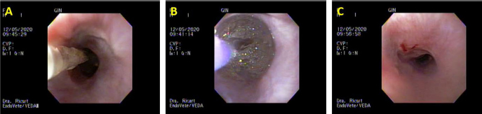 Fig. 2. Third day of endoluminal dilatation and second triamcinolone injection. (A) Initial dilatation with a Boston Scientific CRE balloon of 12 mm. (B) Balloon inflated during the maneuver; note there is no evidence of bleeding or tearing of the mucosa. (C) Macroscopic evaluation of mucosal damage after the third dilatation of the day; mild tearing is observed.