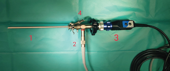 Fig. 3. Cystoscopy set. Numbers indicate certain equipment. 1, Karl Storz rigid cysto-urethroscope sheath, 14 Fr size; 2, Karl Storz fiber optic light cable; 3, Karl Storz telecam camera head with a connected Hopkins 30-degree, 2.7 mm diameter, and 18 cm length rigid telescope; 4, sheath has three separate channels: one is used as a working channel and the other two for irrigation and suction.