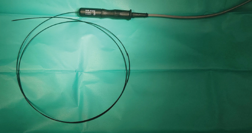 Fig. 4. Semirigid Karl Storz monopolar coagulating ball electrode (3 Fr × 53 cm) connected to a monopolar 4 mm Ø HF connection cable. Another hydrophilic 3 Fr pigtail-type catheter was introduced through the working channel with one end opening into the left kidney pelvis and another into the bladder. It was used to prevent ureteral tunnel healing and was left in for 7 days. Amoxicillin and clavulanic acid solution (Synulox RTU® 140 mg/ml–0.2 ml s.c.) was injected after the procedure and tablets were given at home (1/2 BID). NSAIDs were given s.c. once (Meloxidyl ® 5mg/ml solution–0.09 ml s.c.) and prescribed (Meloxidyl® 1.5 mg/ml solution–0.15 ml p.o.) to use 3 days SID, and relieve postoperative irritation and pain.