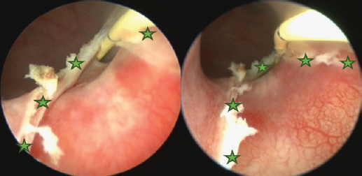 Fig. 7. Cystoscopy pictures where green stars indicate edges of the cut ureteral membrane. A yellow 3 Fr guide catheter is seen on the right side of both pictures.