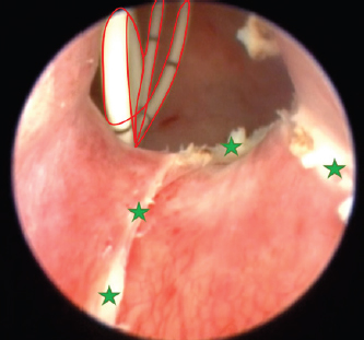 Fig. 8. Cystoscopy picture taken after cutting the ureteral membrane (see the green stars). A 3 Fr pigtail type catheter is outlined in red; it is curled inside the urinary bladder. Complications in ectopic ureter surgical management are not rare whatsoever. Continued postoperative incontinence is the most frequent as well as disappointing, and might result in euthanasia later in life (McLoughlin and Chew, 2000; Noël et al., 2017). Intramural ureter recanalization after ligation or cauterization is another possible malady (Smith et al., 2010; Ferreira et al., 2019). To prevent that, the authors suggest double ligation (McLaughlin and Miller, 1991). We assumed that cauterized ureteral walls might recanalize too; therefore, we used a pigtail catheter for them to not have any contact. From our experience, 6 days are enough for the mucosa to fully heal. [Ferreira et al. (2019) reported leaving the catheter in for 11 days. The reason for insertion was to prevent ureteral stenosis, possibly due to cautery-related edema.] Abdominal surgery resulted in a higher rate of more severe complications. 50% of the dogs after ureteral reimplantation developed worsening hydroureter or hydronephrosis; 16% of the dogs after the intravesicular transplantation technique had dysuria; and 8% of the dogs with ureteronephrectomy developed renal failure (Berent et al., 2012). A complication rate of 26% occurred after surgical correction by modified neoureterostomy or ureteroneocystostomy (Reichler et al., 2012). Severe laser ablation procedure complications involve uroretroperitoneum or uroabdomen, which we successfully avoided. It is reported that the overall complication rate in a minimally invasive approach is rare, which is the reason why professionals might prefer modern surgical solutions (Smith et al., 2010). Carrying out a minimally invasive urosurgery in a 1.7 kg toy dog was risky and challenging, especially considering that this has been seldom described. The smallest weight was reported to be 2.7 kg. The same study suggested that female dogs who weigh more than 20 kg have worse continence outcomes (Berent et al., 2012). McLoughlin and Chew (2000) stated that cystoscopy is safe in puppies above 3 kg of weight. Although our patient was almost twice as small, we achieved satisfactory results. The poodle is now fully capable to urinate voluntarily; no serious complications have been noticed. The patient succeeded in full continence after monopolar cauterization and medical treatment with phenylpropanolamine syrup. We speculate that as the animal matures, the urethral muscles will tend to strengthen. Additionally, prescribed phenylpropanolamine could have further developed the sphincter muscles. This case report is a proof that monopolar electrocautery is safe if used wisely and with caution. We recommend continuing further research in the use of monopolar electrosurgery. More studies should be conducted to fully evaluate complication rates and outcomes. We also recommend using a monopolar electrode to manage ureterocele. AcknowledgmentThe authors thank Vilnius College for supporting this research. Authors’ ContributionsAll authors contributed to the study. All authors read and approved the final manuscript. Conflict of interestThe authors declare that there is no conflict of interest. ReferencesBerent, A.C., Weisse, C., Mayhew, P.D., Todd, K., Wright, M. and Bagley, D. 2012. Evaluation of cystoscopic-guided laser ablation of intramural ectopic ureters in female dogs. J. Am. Vet. Med. Assoc. 240(6), 716–725. Evans, H.E. and De Lahunta, A. 2013. Miller’s anatomy of the dog. Elsevier Health Sciences, Amsterdam, Netherlands. Fernández-Bautista, B., Hernández, A.P., Rodríguez, R.O., Lucena, L.B. and Madero, J.A. 2019. Tratamiento endourológico del muñón ureteral sintomático posnefrectomía. Actas Urol. Esp. 43(1), 39–43. Ferreira, A.A., Tortato, N.N.G., Teixeira, W.T., Albernaz, V.G.P., Carareto, R., Froes, T.R., Castro, J.L.C. and Dornbusch, P.T. 2019. Use of monopolar cauterization by cystoscopy for ectopic intramural ureter correction in a bitch. Acta Sci. vet. 47(Suppl. 1), 426. Hayes Jr, H.M. 1984. Breed associations of canine ectopic ureter: a study of 217 female cases. J. Small Anim. Pract. 25(8), 501–504. Hoey, C.S., Friend, E., Meakin, L.B. and Chanoit, G.P. 2021. Long-term outcome of female dogs treated for intramural ectopic ureters with cystoscopic-guided laser ablation. Vet. Surg. 50(7), 1449–1462. Mayhew, P.D., Lee, K.C., Gregory, S.P. and Brockman, D.J. 2006. Comparison of two surgical techniques for management of intramural ureteral ectopia in dogs: 36 cases (1994–2004). J. Am. Vet. Med. Assoc. 229(3), 389–393. Mclaughlin Jr, R.O.N. and Miller, C.W. 1991. Urinary incontinence after surgical repair of ureteral ectopia in dogs. Vet. Surg. 20(2), 100–103. McLoughlin, M.A. and Chew, D.J. 2000. Diagnosis and surgical management of ectopic ureters. Clin. Tech. Small Anim. Pract. 15(1), 17–24. Noël, S.M., Claeys, S. and Hamaide, A.J. 2017. Surgical management of ectopic ureters in dogs: clinical outcome and prognostic factors for long-term continence. Vet. Surg. 46(5), 631–641. Ortiz, R., Parente, A., Burgos, L. and Angulo, J.M. 2017. Endoscopic urinary diversion as initial management of symptomatic obstructive ectopic ureter in infants. Front. Pediatr. 5, 208. Reichler, I.M., Eckrich Specker, C., Hubler, M., Alois, B., Haessig, M. and Arnold, S. 2012. Ectopic ureters in dogs: clinical features, surgical techniques and outcome. Vet. Surg. 41(4), 515–522. Smith, A.L., Radlinsky, M.G. and Rawlings, C.A. 2010. Cystoscopic diagnosis and treatment of ectopic ureters in female dogs: 16 cases (2005–2008). J. Am. Vet. Med. Assoc. 237(2), 191–195. Soares de Sousa, C.V.S., Rocha, C.C., da Silva, R.S.B., Dutra, A.A., Rocha, B.Z.L.L., Pacó, T.R. and de Paula Antunes, J.M.A. 2021. Ultrasonographic and radiographic diagnosis of ectopic ureter in a dog. Acta Sci. Vet. 49(Suppl. 1)