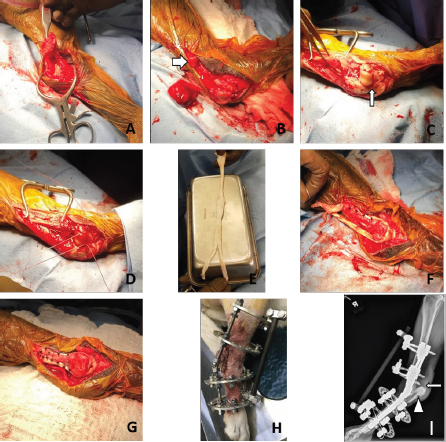 Fig. 1. (A) Gastrocnemius and common tendon severed. (B) Abnormal gastrocnemius and common tendon excision; normal tendon tissue indicated by arrow. (C) Plantar calcaneal notch burred. (D) Double Krackow suture pattern used to reattach gastrocnemius and common tendon through two calcaneal tunnels. (E) SDFT allograft. (F) Allograft sutured to one side and tension applied. (G) Allograft sutured to medial and lateral sides of the native gastrocnemius tendon. Note that additional interrupted sutures were placed to secure the allograft to the native gastrocnemius tendon prior to surgical closure. (H) Hybrid external skeletal fixator (ESF) applied. (I) Postoperative radiograph; the drill tunnels from the proximal tuber to the plantar calcaneal notch are indicated by the arrow and the plantar calcaneal notch is indicated by a triangle. Ethical approvalAll clients provided informed, written consent for treatment of their dogs. As this was a retrospective case series, no ethical approval was required for the study. ResultsThere were 12 surgical repairs of chronic ruptures/deteriorations in 11 dogs that were supported with an allograft and thus included in this report. There were eight spayed females, one intact female, one neutered male, and one intact male. Age ranged from 2 to 11 years (mean=7.1 ± 2.5) and weight ranged from 21.3 to 48.2 kg (mean=29.9 ± 8.0). Follow-up time ranged from 17 to 98 weeks (mean=44.9 ± 24.4). Ten dogs had chronic degeneration of the gastrocnemius and common tendon at their insertion on the calcaneus with an intact native SDFT. One of these dogs had bilateral repairs staged 16 weeks apart (i.e., 11 surgical repairs of chronic gastrocnemius/common tendon degeneration with an intact native SDFT). Ten of these 11 repairs were bolstered with an SDFT allograft and one was bolstered with a DDFT allograft because no SDFT graft was available. One additional dog had a chronic (3-week-old) complete laceration of the Achilles mechanism at the mid-tendon level. This patient had primary tenorrhaphy supported with an SDFT allograft. Of the 12 surgeries performed, 2 repairs resulted in full function, 8 with acceptable function, and 2 with unacceptable function for a success rate of 10/12 cases. The one dog with a 3-week old mid-tendon laceration obtained full functional outcome. Nine of 11 repairs in dogs with chronic gastrocnemius and common tendon deterioration at the calcaneal insertion achieved acceptable or full function with 2 dogs having an unacceptable final outcome. Complications were encountered with 6 of 12 repairs, including 1 minor, 6 major, and 2 catastrophic complications (1 repair had 2 complications and one had 3 complications). One dog was suspected to have a ruptured part of the native superficial digital flexor tendon distal and plantar to the tuber calcaneus in the region of the allograft. This dog developed hyperextension of the digits 28 weeks postsurgery. The dog remained strongly ambulatory without tarsal hyperflexion and no development of sores on any of the pads of the pes. No treatment was provided and the patient continued to have acceptable function 44 weeks postsurgery. Based on strict application of the complication definitions, this was classified as a minor complication. There were two major complications associated with the ESF. One dog fractured metatarsals II–V within the first week following surgery at the level of the distal ESF wires. The ESF was removed and a cast was applied to stabilize the fractures and support the Achilles mechanism repair. The metatarsals healed uneventfully within 2 months of surgery and the cast was removed. That dog has acceptable function 34 weeks postsurgery. Another dog suffered a tibial fracture at the level of the proximal tibial ESF pin 7 days after Achilles repair as a result of a minor trauma. Surgery was performed to stabilize the fracture with two positional screws and extending the ESF proximal to the fracture site. The fracture healed uneventfully and the dog had acceptable function on that limb 59 weeks post-Achilles repair. Two dogs had confirmed infection and fiberwire removal. In one dog, the infection manifested within 20 weeks following surgery; the fiberwire was removed and the dog had an acceptable function 14 weeks following fiberwire removal. Another dog had a broken wire of the ESF and some evidence of infection of the Achilles repair within 10 weeks following surgery. The ESF wire was advanced to address the broken wire and antibiotics were used to address any infection. The dog achieved acceptable function and competed for several months in hunting competitions. However, at 18 months postrepair, the dog had evidence of infection again and so the fiberwire was removed. The owner reported that the final outcome, 2 months following implant removal, was that the hock was hyperflexed. No video or physical exam was performed at this time but given the owner input this patient was classified as having a catastrophic complication with an unacceptable outcome. The other catastrophic complication included recurrence of plantigrade stance in 1 dog 20 weeks following surgical repair. The cause of the plantigrade stance appeared, based on physical examination, to be at the musculotendinous junction, away from the surgical repair performed distally at the tuber calcaneus. Attempted re-repair was offered but the owners elected pantarsal arthrodesis instead. DiscussionOur subjective impression is that the success rate in this study is at least comparable if not superior to our success rates using simple repairs without any augmentation of the tenorrhaphy. This impression is tentatively supported by previous studies that cite unacceptable outcomes of up to 30% in cases without tenorrhaphy augmentation (Worth et al., 2004; Nielsen and Pluhar, 2006; Corr et al., 2010), as well as the numerous surgeons and reports that document use of tenorrhaphy augmentation (Nellas et al., 1996; Shani and Shahar, 2000; Bal