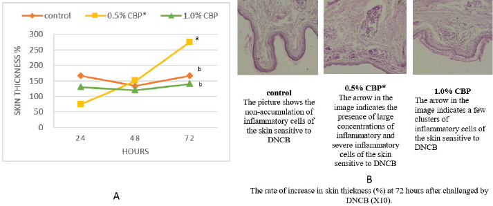 Fig. 4. The effect of adding clove buds powder to the broiler’s diet in different levels clove buds powder on skin thickness in broiler chickens on hours 24, 48, and 72-post challenge with DNCB. (*): Clove Buds Powder. Different letters within a treatment indicate a significant difference between the means at the level of probability differences between the means at the level of probability (p < 0.05). DiscussionEugenol is the main component of clove extract (70%–90%) (Barceloux, 2008), and it is found in many other plants such as basil, cinnamon, nutmeg, and bay leaf. Eugenol is a volatile phenolic constituent of clove characterized by many beneficial effects, whether on the animal’s productivity or health performance. Therefore, the measurement of blood parameters is one of the most efficient screening assessments to evaluate their effect on the immune system. The results obtained from our data (Fig. 1A) showed a limited effect of adding clove bud powder on the TCL, as well as the DCL. The non-appearance of adverse effects as a result of adding clove bud powder to TCL is considered an encouraging matter if compared with the improvement of other productive traits or physiological parameters. The same conclusion was observed by Toghyani et al. (2010) who mentioned that feeding broilers thyme supplementation had no adverse effect on their blood profile. Additionally, supplementation of some Libyan medicinal plants in the broiler’s diet had no significant effect on TCL (Asheg et al., 2015). On the contrary, Abdel Fatah et al. (2020) reported a decrease in WBC in broilers fed clove powder (2%) in the diet. It can be noticed that the high concentration of clove may cause undesirable effects. It was mentioned that herbal medicines may have side effects or be ineffective (George, 2011), or be toxic (Nasri and Shirzad, 2013). Some previous studies reported that the inclusion of phytogenic feed additives increased WBC counts (Amad et al., 2013; Wati et al., 2015). Moreover, adding medicinal plants or their oils, such as thyme and cinnamon (Al-Kassie, 2009), thyme oil (Adam et al., 2020), or bay leaf (Mohammed et al., 2020) increased the WBC significantly. It is clear that adding cloves or other medicinal plants or their extracts had a positive effect on WBC counts. The superior effect of medicinal herbs on WBC may be due to the phytochemicals ability to stimulate immune systems and lymphoid organs and reduce metabolic stress in the body, which enhances better utilization of nutrients in the body to build up blood cells. Regarding the differential WBC count findings in Figure 1B and C, our results agreed with what was concluded by Al-Asheq et al. (2015). They indicated that supplementation with aromatic plants in broilers’ diet significantly decreased the heterophils percentage and increased the lymphocytes percentage in the third week. While there was no significant effect at the end of the experiment (the sixth week) on the percentage of heterophils or lymphocytes. In addition, our results indicate that there was no significant change in the H/L ratio at the end of the experiment, which is in agreement with the inference of Toghyani et al. (2010). Furthermore, Najafi and Torki (2010) found that adding cloves did not have a significant effect on the lymphocyte percentage or heterophil percentage. In general, most studies reported that aromatic plants had a beneficial effect on differentiated WBC, and this agreed with the results of the third week of our study as shown in Figure 1G. Along the same lines, Gandomani et al. (2014) pointed out that the dietary inclusion of clove bud powder decreased the heterophil percentage and increased the lymphocyte percentage, which in turn reduced the H/L ratio. Additionally, supplementation with phytogenic feed additives (fennel, melissa balm, peppermint, anise, oak, clove, and thyme) significantly contributed to increasing the lymphocyte percentage and decreasing the heterophil percentage and the H/L ratio (Wati et al., 2015). The decrease in Heterophil percentage and increase in lymphocytes percentage is attributed to the antioxidant and anti-inflammatory effects of clove buds (Wati et al., 2015). Likewise, Gandomani et al. (2014) stated that clove bud had a strong antioxidant effect, which reduced oxidative stress in immune cells and increased the number of lymphocytes. The H/L ratio is a good signal of the health status of birds, as a higher ratio indicates that the birds are under severe stress (Al-Darraji, 1995). Therefore, aromatic herbs as antioxidants play an important biological role in improving immunity by lowering the H/L ratio in the blood of birds (Ojala et al., 2000), and this was approved by Naderi et al. (2014) when feeding broilers on cinnamon and turmeric , as well as when feeding on laurel leaves (Mohammed et al., 2020). The result of our study related to the serum total cholesterol in Figure 2A was in agreement with some other studies. Broiler chicks fed on a basal diet containing clove essential oils did not show a significant change in plasma cholesterol (Najafi and Torki, 2010; Azadegan et al., 2014). Other studies conducted on dietary supplementation with anise seed (Soltan et al., 2008), thyme powder (Toghyani et al., 2010), or basil essential oil (Riyazi et al., 2015) indicated that there is no significant effect on plasma cholesterol. In addition to the above, feed additives may have hypolipidemic activity. Venkadeswaran et al. (2014) found that eugenol inclusion reduced total cholesterol, LDL-cholesterol, and triglyceride levels. Moreover, dietary clove powder in broilers (Mahrous et al., 2017) and clove oil in laying hen diets (Şehitoğlu and Kaya, 2021) significantly lowered serum total cholesterol. Besides, supplementation with cinnamon, thyme, and Alchornea cordifolia leaf meal significantly decreased total cholesterol concentration in serum (Najafi and Taherpour, 2014; Oloruntola et al., 2016). Serum AST and ALT co