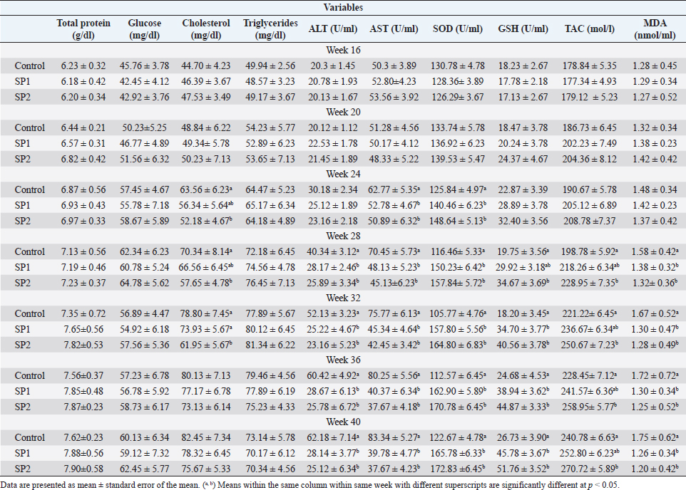 Table 4. Blood plasma concentrations of biochemical and enzymatic variables of Barki lambs supplemented with SP levels of 0 ml (control), 50 ml (SP1), and 100 ml (SP2)