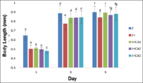 Fig. 1. The body length of embryonic zebrafish at 3, 6, and 9 dpf in the treatment groups. (a–g) Different notations show significant differences. Data are shown as the mean ± SD. Molecular interaction prediction of asiatic acid with IGF-1RThree-dimensional molecular docking prediction showed interaction binding between asiatic acid and the IGF-1R. The results showed interacting residues of the ligand and protein, mediated by five conventional hydrogen bonds and two hydrophobic bonds between amino residues Asn717, Asp328, Val326, Asn349, Val326, and Ala710, but interacting residues of the insulin and IGF-1R, mediated by all eight conventional hydrogen bonds at amino residues Arg351, Asp328, Asn349, and Val326 (Fig. 3). Those bonds interacted with van der Waals energy, thus resulting in an energy binding of asiatic acid to IGF-1R (191.2 kJ/mol) lower than insulin to IGF-1R (-7.2 kJ/mol) (Table 1). DiscussionEffect of IH in zebrafish embryosHypoxia in this animal model was applied as an intermittent schedule at 2, 24, 48, and 72 hpf. At 18 hpf, zebrafish embryos are very tolerant of anoxia, and the cardiovascular and nervous systems are just starting to form. At 24 hpf, the heart tube expands, and the heartbeat starts. At this age, anoxia tolerance decreases, and the embryo upregulates 148 genes in response to severe hypoxia. At 36 hpf, the cardiovascular system is well developed with circulating red blood cells, reduced anoxia tolerance, and embryos hatch into larvae up to 48 hpf (Robertson et al., 2014). In this study, the effect of IH was growth retardation in the body and head of zebrafish, but no inflammation was detected. IH, defined as recurrent hypoxia-reoxygenation cycles, induces inflammation cascades that impact multisystem morbidity, such as retinopathy of prematurity, growth retardation, defects in neuronal development, and the respiratory-circulation system). Many adverse effects of IH on children’s behavior, academic achievement, and cognition correlate with hypoxia duration, severity, and onset age. Cycles of hypoxia/reoxygenation frequently lead to a proinflammatory cascade with resulting multisystem morbidity, such as retinopathy prematurity, growth retardation, cardiorespiratory instability, and neurological defects (Serebrovskaya and Xi, 2015). In this study, zebrafish embryos were exposed to IH for 4 hours daily, although it could occur nocturnally. According to Fitzgerald et al. (2016), in a seasonal environment, during the warm season, hypoxia is related to the formation of a thermocline in surface waters, which results in excess oxygen consumption as organic matter decomposes in the lower water layers. Continuous exposure to hypoxia in the process of embryogenesis causes hypoxic events to persist in the long term.