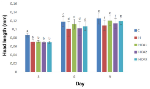 Fig. 2. The head length of embryonic zebrafish at 3, 6, and 9 dpf in the treatment groups. The embryos in the control group were shown to have a significantly more extended head length than those in the other groups (p < 0.05). (a–e) Different notations show significant differences. Data are shown as the mean ± SD.