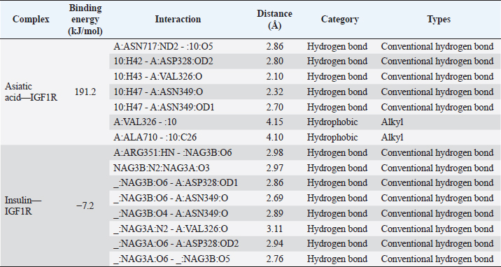Fig. 3. (A–C) The molecular interaction prediction between asiatic acid from CA and the IGF-1R compared to the IGF-1-insulin complex (D–F). Table 1. The binding interaction between asiatic acid and the IGF-1R.