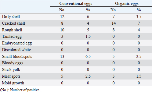 AbstractBackground: Organic egg is among the most common organic foods offered for sale in Egyptian markets in recent years, and consumers buy them at a higher price because they believe organic eggs are safer and have superior nutritional value than conventional eggs. Aim: The present work aimed to monitor antimicrobial residues in brown table eggs, whether conventional or organic type, in Aswan governorate markets and assessed their physical and chemical quality and their public health hazards. Methods: Brown table egg samples (n=400 total) were randomly selected in the present study, in which they represented two equal groups (n=200 each) including conventional eggs and organic eggs. Eggs were collected from different retail stores in the Aswan governorate, Egypt. Egg samples were subjected to thorough physical and chemical quality evaluation as well as an assessment of antimicrobial residues. Results: The results reported that organic eggs were cleaner and had a better odor, less blood, and meat spots, but smaller with more shell cracks than conventional eggs. Chemical analysis of some nutrient contents in the egg yolk revealed significantly higher nutritive values of organic eggs than that of conventional ones as the organic eggs contain significantly higher levels of vitamin A and vitamin D/D3 and significantly lower values of cholesterol, calcium, magnesium, and zinc than those in conventional eggs. Disc diffusion assay has been used for monitoring antimicrobial residues in egg samples. The results have shown that all examined organic eggs were free from antimicrobial residues, while 12% and 8% of conventional egg yolk and white were positive for antimicrobial residues, respectively. Conclusion: The study concludes the higher nutritive value of organic eggs compared with the conventional type because of their significantly higher contents of vitamins A and D and their significantly lower contents of cholesterol. Moreover, organic eggs were free from antimicrobial residues which maximizes their public health benefits.. Keywords: Antimicrobial residues, Chemical and physical quality, Conventional eggs, Nutritive egg values, Organic eggs. IntroductionEggs are considered a highly valuable and economical source of animal protein (Żakowska-Biemans and Tekień, 2017). Egg protein is second to breast milk in its benefits and has the closest nature to breast milk protein. Moreover, the human body can successfully absorb approximately 98% of the protein in eggs (Xia et al., 2022). In Egypt, chicken eggs are considered an important component of human daily nutrition intake, one of the most popular foods, and one of the least expensive when compared to other nutrients from animal sources (Karmi et al., 2019). Eggs often provide people of all ages with well-balanced nutrients; they contribute 20% to 30% of the vitamins E, A, and B-12 and 10% to 20% of the dietary folate for egg consumers. Furthermore, eggs are suitable for many adult therapeutic diets because of their ease of digestion and low-calorie content (Ebied et al., 2021). In recent years, medical and nutritional scientists discover new functions and nutritional values of eggs in health care such as the prevention and treatment of atherosclerosis, improvement of intelligence, nourishment of the brain, delaying of aging, prevention of cancer, and protection of liver (Xia et al., 2022). Housing systems may exert a significant impact on poultry products and their quality. Whenever it concerns the performance, health, and welfare of the birds, every housing system has benefits and drawbacks. For layer chickens, the ideal housing design should be considered to maximize egg production and egg quality properties (Batkowska et al., 2014), Regarding the layers of housing systems in Egypt, egg production, egg weight, and egg mass were better obtained in the cage system rather than floor system (Abo Ghanima et al., 2020). Furthermore, customers are becoming more and more interested in poultry products from alternative housing systems because they are natural, organic, and contain fewer harmful substances to human health (Da Silva Pires et al., 2021a, 2021b). The housing system effect on the egg quality produced by layers is conflicting, some research reporting no difference in egg quality (Ahammed et al., 2014). Meanwhile, a very recent study emphasizes that more optimum production results could be obtained by alternative housing systems (free-range system) (Alig et al., 2023a). Currently, because of the presence of toxic substance residues such as antimicrobials, heavy metals, mycotoxins in conventionally produced food, the demand for organic food has increased (Śmiechowska and Dmowski, 2005). Antimicrobials are typically used by poultry farmers as drugs in drinking water or feed to prevent or treat illnesses as well as a growth stimulator (Hafez et al., 2013). Tetracyclines, quinolones, aminoglycosides, macrolides, beta-lactams, and sulfonamides are just a few of the antibiotic families used to treat egg-laying chickens that are almost identical to those used in human medicine. As a result, their residues are prohibited in human food (Stolker and Brinkman, 2005). Additionally, the use of antimicrobials in laying hens without proper control may result in the accumulation of residues in eggs, causing a risk to the health of consumers. When the utilization of antibiotics is required for illness treatment or prevention, a withdrawal period may be observed until the residues vanish or become insignificant (Nisha, 2008). Antimicrobial residues in eggs may lead to toxicity, skin rashes, allergic reactions, antibiotic resistance, and the emergence of cross-resistance across other antibiotics with comparable structural features or the same mode of action (Roberts, 2004; Shehata et al., 2014). In organic chicken farms, the use of antibiotics is prohibited; instead, the birds may get vaccines as a kind of preventative medicine and nutritional supplement