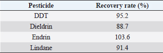 In general, El-Behera province was the most contaminated province with OC residues in raw cow’s milk, with an incidence level of 53.3%, followed by Alexandria, with an incidence level of 44%, and Matrouh province has the lowest incidence rate of 40%. Gas chromatography with a microelectron capture detector exhibited excellent repeatability, as indicated by the coefficient of variation below 10%. Limits of detection and quantification were determined using the average blank values method. Mean recoveries ranged from 88.7% to 103.6% for OC pesticides (Table 2). DiscussionOCPs were still widely used for agricultural and human pest control management in some tropical nations in the early 1980s despite being illegal. Due to OCs slow breakdown rate and lengthy half-life, which give them the property of high environmental stability, this contaminated the environment and the food chain. Additionally, due to their lipophilic nature, milk animals store pesticides in tissues rich in fat, then transferred them to milk fat (Aslam et al., 2013). A higher incidence of contamination with total DDT in Behera than in the other two provinces may result from the expansion of agricultural land and its extensive use. The lower level of DDT in raw milk was recorded by Sharma et al. (2007) in bovine milk collected from India was 36.7 ng/g with an incidence of 97%; Darko and Acquaah (2008) in cow’s milk in Ghana was 12.53 ng/g; Ismail and Elkassas (2016) in buffalo milk in Egypt was 22.6 ng/g. At the same time, a higher level was reported by Nasef et al. (2019) in raw milk collected from three districts (A–C) in Alexandria provinces 217, 251, and 306 ng/g with lower incidence rates of 10%, 6.66%, and 10%, respectively. According to permissible limits established by EC (299/2008) (åDDT, 40 ng g–1 fat), 21.3%, 18%, and 8.0% of examined raw cow’s milk samples exceed this limit. Sharma et al. (2007) found that 35 bovine milk samples in India out of 147 samples (23.81%) exceeded the permissible limits recommended by FAO. According to the permissible limits established by EC 299/2008 (6 ng/g), all contaminated samples with dieldrin exceeded the limit. A low level of dieldrin was reported by Darko and Acquaah (2008) in cow’s milk in Ghana was 1.32 ng/g. A higher level was reported by Nasef et al. (2019), who found that dieldrin was detected in 10% and 6.66% of examined raw milk with a mean value of 147 and 163 ng/g, respectively, in distract “A” and “B” in Alexandria city. In Giza, Egypt, a study by Ahmed and Zaki (2009) indicated that the prevalence of dieldrin in raw milk was 55.5%, with a mean value of 2,966 ng/g. On the other hand, Salem et al. (2009) could not find dieldrin residues in milk samples taken in Jordan. Table 2. Mean recoveries of OC pesticides.
