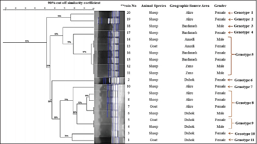 Fig. 4. Dendrogram created from ERIC-PCR banding pattern of 20 C. pseudotuberculosis isolates from pus samples taken from slaughtered sheep and goats that have been diagnosed with positive CLA. The similarity analysis was performed using dice coefficient and UPGMA method in GelJ software (v.2.0). Concerning sex, in general, females had a greater prevalence rate than males in both sheep and goats. However, differences in the prevalence of disease between study locations were found in terms of gender. The higher rates in females are probably due to the fact that females of sheep and goats in the study area were usually kept for s longer period than males for breeding purposes which exposes females to predisposing factors like pregnancy, shearing, and interaction with sick animals, as previously reported by Yitagesu et al. (2020) and supported by Issa et al. (2021). Whereas, our data found that the prevalence rate in sheep in Sumel was significantly higher (p < 0.01) in rams than ewes which is probably due to the intensive husbandry where rams physically interact more than ewes during the mating season, the risk of pressing on and rupturing abscesses increases. Furthermore, the quantity of acute-phase proteins, primarily haptoglobin, is significantly higher in males than in females in response to C. pseudotuberculosis; it has been suggested that the development of CLA may be influenced by increased haptoglobin levels in sheep in response to the bacterium (Eckersall et al., 2007; Jeber et al., 2016). However, CLA, on the other hand, is a non-sex-linked illness, implying that its occurrence is based on immunity, which may be influenced by gestation, breastfeeding, immunosuppressive disease, diet, and other management variables that affect both sexes (Oreiby, 2015). We generated a phylogenetic tree using maximum likelihood to verify the phylogenetic relationship of C. pseudotuberculosis isolates in this study and other strains of C. pseudotuberculosis isolated in previous studies by researchers. The phylogenetic tree of C. pseudotuberculosis showed that the sequences from goats and sheep were clustered and were in cluster with a sequence previously detected from India, China, and Egypt. This is most likely because they came from the same source and might have been transmitted by diseased animals; the boundaries of the study area are not well controlled and the animals’ transportation is done by smuggling because of the huge difference in animal prices between these areas. These findings were further confirmed by the ERIC-PCR fingerprinting analysis, as mentioned below. The ERIC-PCR fingerprinting analysis was used to assess the genetic diversity and similarity of 20 strains of C. pseudotuberculosis isolated from slaughtered sheep and goats with CLA in the five districts of Duhok Province. The data revealed a high genetic diversity among the isolated C. pseudotuberculosis strains (11 genotypes) which probably show many clones of C. pseudotuberculosis circulate in our region, possibly from different geographic regions, as Duhok Province receives animals for slaughter from various locations (both native and imported from nearby counties). The spread of a large number of bacterial genotypes into an area resulted from the entrance of animals from various locations (Guimarães et al., 2011; Sellyei et al., 2017). Strain variations among microbial communities occur as a result of the movement of bacteria between different hosts or ecosystems, certain DNA sequences may be added or deleted, causing mutations (Jerome et al., 2011). The similarity between the isolates from the different locations of the study area is probably because the infected animals transferred between the locations for pasturing particularly during the drought seasons, these findings are in line with that reported earlier by Taha (2022). Different genes, such as 16s rRNA (Çetinkaya et al., 2002) and rpoB genes (Khamis et al., 2004; Abdulrahman et al., 2020; Abdulrahman, 2021), have been used to generate a phylogenetic tree in C. pseudotuberculosis isolated from CLA cases in sheep and goats. According to the phylogenetic analysis of 16s rRNA gene sequences, out of 20 isolates of C. pseudotuberculosis, 16 isolates were genetically identical clones, which is not in line with what was found by ERIC fingerprinting analysis, where all strains were grouped into 11 genotypes (11 ERIC types), resulting in a significant level of genetic variation. The distinction between both techniques (the ERIC-PCR technique and 16S rRNA gene sequencing) is probably the size and area of the chromosomes sequenced for the genetic diversity assessment. Where 16S rRNA gene sequencing depends on a specific area of the chromosome, the possibility of detecting genetic changes through 16S rRNA gene sequence analysis is limited (Ogier et al., 2019). In contrast, because the ERIC primers include many annealing sites on the bacterial genome, it can be used to analyze the whole chromosome for any DNA sequence variation (Wilson and Sharp, 2006), which may offer the best chance to evaluate genomic diversity using ERIC-PCR. Thus, when compared to other molecular typing tools (ribotyping), the finding suggests that ERIC PCR is a useful genotyping technique for the study of genetic diversity in bacterial species. This study’s findings support the assumption that ERIC PCR possesses a strong capacity for discrimination and is an effective molecular typing method for detecting genetic diversity, specifically for identifying the source of infection (Taha, 2022). ConclusionIt is concluded that the prevalence of the diseases in sheep and goats in Duhok Province is low, but the risk of increasing its rate is high; more biosecurity measures on imported animals must be applied to minimize or maintain the disease’s prevalence rate. In Duhok Governorate, numerous C. pseudotuberculosis clones are circulating. Multivariable factors were found to play roles in the disease’s pre