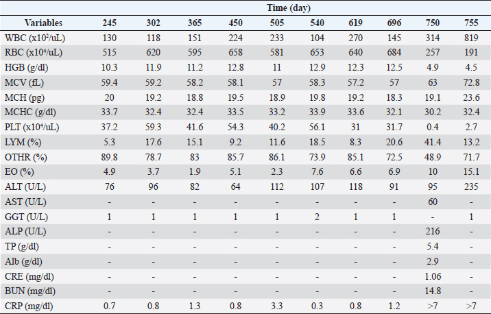 Figure 1 and Table 2 show the history of therapeutic and supplement use, and changes in blood test values over time between days 0 and 209. On day 1, the patient was observed to be in good health and consumed a small amount of meat, including a small amount of white meat. However, since the patient vomited a little saliva early in the morning and did not have food at night, which affected treatment compliance for famotidine (0.9 mg/kg bis in die: bid) and amoxicillin (17.9 mg/kg bid) as they were orally administered. On day 2, since it was observed that the patient could eat only his favorite snacks, critical liquid (150 ml, semel in die: sid) was administered orally. On day 4, the patient could eat pet food and had an increase in appetite. Blood test findings showed that WBC levels were 2.2 times higher than those at the initial visit, while RBC, HCT, HGB, MCH, and MCHC were 7.8%, 5.6%, 19.7%, 12.7%, and 14.9% lower, respectively. However, MCV, PLT, LYM, and EO levels were normal. Although the CRP level had decreased to approximately 45% of the level at the time of the initial visit, it was 3.8 times the upper limit of the reference value. Based on these results, the oral dose of prednisone was tapered from 1.3 mg/kg bid to 0.9 mg/kg bid. Gamma-glutamyl transpeptidase (GGT) levels were within the reference limits, while the ALT levels were found to be 68% higher than those at the initial visit, resulting in the administration of ursodeoxycholic acid (UDCA) at 9 mg/kg bid to assist with liver function. On day 6, compared to the previous examination on day 4, the WBC count increased by 14.3%. Additionally, EO increased by 218.2%, moving from the baseline to above the baseline, while RBC count and HCT decreased by 11.8% and 11%, respectively, which were still below the baseline values. Blood HGB increased by 8.2%, which remained below the baseline. The MCV, PLT, and LYM values were within the reference values. The MCH and MCHC increased by 22.7% and 21.2%, respectively, and were converted to be within the reference values. Based on these results, the oral dose of prednisone was changed from 1.3 mg/kg bid to 0.9 mg/kg bid. Although the patient could eat food as long as it was a snack, a recurrent loss of energy and appetite was observed. Based on these observations, equine placenta extract (eqPE) was administered at 125 mg sid with the aim of reducing physical exhaustion and enhancing anti-inflammatory effects. In addition, ampicillin sodium (20 mg/kg) was replaced with enrofloxacin (5 mg/kg) by intravenous/subcutaneous injection under the same conditions as those on the first day. On day 11, a marked increase in appetite, without vomiting, was observed. Compared with day 6, the WBC count increased by 74%, which was above baseline. RBC, HCT, and HGB levels decreased by 21%, 20.5%, and 19.7%, respectively, which were still below the baseline values. The MCV, MCH, MCHC, PLT, and LYM levels were within the normal range. The EO level decreased by 14.3%, which was still below the normal range. The ALT level was 388.3% higher than that on day 4 and was still above baseline. GGT levels increased by 600% and changed from substandard to normal. Although the CRP level decreased by 64.1% from day 6, it was still above the baseline. Based on these results, the oral dose of prednisone was slightly tapered from 0.9 mg/kg bid to 0.8 mg/kg bid. ALT levels were 388% higher than those on day 4. GGT levels remained within the normal range. On day 18, a marked increase in appetite, without vomiting, was observed. The patient was also observed to be in good physical condition. Compared to day 11, ALT decreased by 18.5% but was still above the reference level. The CRP level increased by 8.6% and remained above the baseline. GGT level was within the reference range. On day 28, because the good physical condition of this case was confirmed to have been maintained, the prescription of orbifloxacin was deemed unnecessary and was discontinued.