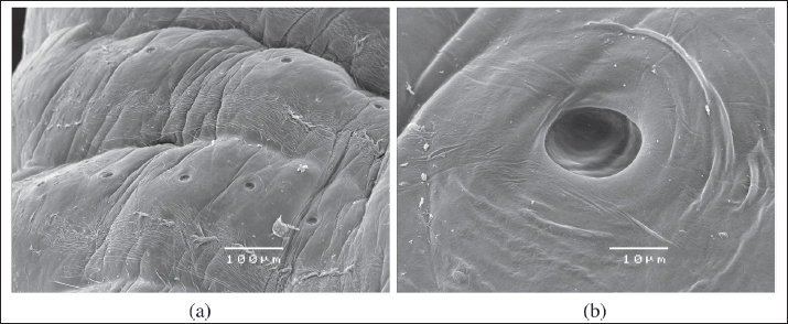 Fig. 4. SEM of the sensory pore structure of the annuli of a female L. serrata specimen (A: scale bar 100 μ; B: scale bar 10 μ). For molecular identification to the species level, two small pieces of the body of the specimen were cut for DNA extraction. Molecular analyses were performed by BMR Genomics (Padua, Italy, https://www.bmr-genomics.it/). Genomic DNA was extracted using the commercial PCRBIO Rapid Extract Lysis Kit (PCR Biosystems) following the manufacturer's instructions. A fragment (about 700 base pairs in length) of the mitochondrial gene for cytochrome C oxidase subunit 1 (COX-1) was used as a DNA barcoding system and amplified. The polymerase chain reaction (PCR) amplification was carried out in a final mixture containing 12.5 μl of AmpliTaq Gold™ 360 Master Mix (Thermo Fisher), 2 μl of gDNA extracted, 1 μl (10 μM) of LCO1490 primer (5′-GGTCAACAAATCATAAAGATATTGG-3′), 1 μl (10 μM) of HCO2198 primer (5′-TAAACTTCAGGGTGACCAAAAAATCA-3′), and deionized water, reaching a total reaction volume of 25 μl. The PCR reactions were subjected to the following conditions in a thermal cycler (Mastercycler®, Eppendorf): 95°C × 2′, then 5 cycles (95°C × 40ʺ, 45°C for 90ʺ, and 72°C for 90ʺ), followed by 35 cycles (95°C for 40ʺ, 50°C for 90ʺ minutes, and 72°C for 60ʺ minutes), and finally 72°C for 10′. The amplification products were visualized after electrophoresis on 1.5% agarose gel. PCR products were purified with ExoSAP-IT™ (Thermo Fisher), sequenced, and aligned via BLAST analysis to detect their identity by retrieving similar sequences deposited in NCBI's GenBank database (Zhang et al., 2000; Morgulis et al., 2008).