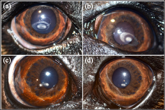 Fig. 1. Cavalier King Charles Spaniel with (a) CCD OD and (b) OS classified as grade 2 at first presentation, and subsequently classified as grade 1 after 12 months of topical 1% CsA treatment (c) OD and (d) OS. Ethical approvalNot needed as this was a retrospective study. ResultsNinety-two dogs (163 eyes) of 23 different breeds fulfilled the inclusion criteria (Table 1). Brachycephalic breeds were overrepresented (38/92; 42%). There were 50 females and 42 males of a median age of 6 years at presentation (range: 1–16 years) (Table 2). Seventy-one dogs (71/92; 77%) were bilaterally affected (142 eyes), and 21 unilaterally (21/92; 23%), being 12 ODs and 9 OSs affected. Table 1. Breed distribution according to their treatment group.