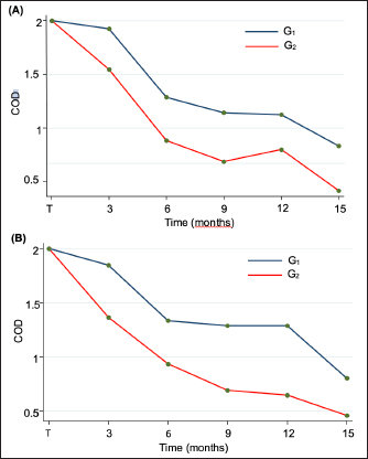 Fig. 2. Longitudinal analysis of efficacy in treated groups (G1 and G2) showing a COD reduction as the treatment time increased in (A) OD and (B) OS. COD: Corneal opacification degree; G1: Group of dogs treated with 1%CsA once daily; G2: Group of dogs treated with 1%CsA twice daily. Apart from 2 G2-dogs (3/163 eyes; 2%) which had excessive tears, no other side effects were noticed. The first dog (1 eye) presented with epiphora during the last examination at 6 months. The second one (2 eyes), with epiphora at 9 months of therapy, had no longer corneal deposits, and the tearing resolved after reducing frequency to once daily. DiscussionCCD is a common ophthalmic disease in dogs that, if left untreated, can cause amblyopia, discomfort, corneal erosion, and ulceration (Cooley et al., 1990). This study analyzes the clinical efficacy of topical 1% CsA eyedrops on the treatment of CCD in dogs. To the best of the authors’ knowledge, this is the first report of a medical approach for CCD treatment in veterinary medicine.