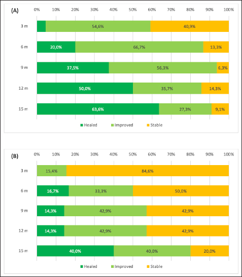 Fig. 3. Longitudinal analysis of G2 showing the percentages of total eyes classified by COD grade during the follow-up (months). Results are presented for (A) the right and (B) the left eye. The three COD grades were: grade 0 (deposit no longer detectable with slit-lamp biomicroscopy, “healed,” shown in dark green), grade 1 (reduction of opacity, “improved,” shown in light green), and grade 2 (baseline, “stable,” shown in yellow). Grade 3 (increased opacity, “worsened”) is not shown since no dogs presented this COD grade in G2. COD: Corneal opacification degree; G2: dogs receiving topical 1% CsA twice daily. Although CCD has been described in many different canine breeds, brachycephalic dogs were overrepresented in the present study, which is not surprising based on their anatomical conformation features such as short noses, shallow orbits, and projected eyeballs, predisposing these individuals to suffer from tear film instability and dry eye syndrome (DES) (Dinesh and Pookode, 2019). In addition, they may have low corneal sensitivity, incomplete and less frequent blinking, and a thin lipid layer tear film, leading to areas of chronic drying, especially the central part of the cornea (Carrington et al., 1989; Packer et al., 2015). Interestingly, DES has been associated with abnormal tear lipid deposition in mice (Chen et al., 2020). In general, CCD does not respond to medical treatment, and topical anti-inflammatory medications may exacerbate the lesion. Low-fat diets are anecdotally suggested to prevent the progression of the disease (Whitley and Ralph, 2021). The corneal lesions can be removed by keratectomy if the opacity is obstructing vision significantly. However, the opacities may recur after keratectomy; therefore, surgery is recommended for corneal dystrophy only as a last-resort measure in dogs with significant visual deficits. Due to the ophthalmic complications that could be derived from a nontreated CCD, finding a topical medication that reduces corneal opacity is mandatory.