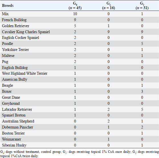 AbstractBackground: Crystalline corneal dystrophy (CCD) is the most common type of corneal lipidic deposition in dogs. CCD is a primary metabolic disorder of the corneal fibroblast featuring an accumulation of extracellular and intracellular lipid deposits. Corneal lipid deposits create a corneal opacity and modify the interfibrillar collagen distance, inducing light scattering. Corneal vascularization is not usually associated with the disease, but, in case of chronicity, cell death may produce inflammation, and new corneal vessels are developed. To the best of the authors’ knowledge, this is the first report of a medical approach for CCD treatment in veterinary medicine. Aim: To evaluate the efficacy of topical 1% cyclosporine eyedrops (1% CsA) for the treatment of CCD in dogs. Methods: Medical records of dogs with CCD were retrospectively reviewed (2009–2020). Corneal opacification description (COD) [size (mm), depth, and opacification degree (0–3)] was evaluated at 0, 3, 6, 9, 12, and 15 months postinitial diagnosis. Dogs were classified into three groups: the control group (G0), the group receiving topical 1% CsA once per day (G1), and the group receiving topical 1% CsA twice daily (G2). Results: Ninety-two client-owned dogs (163 eyes) of different breeds, ages, and gender fulfilled the inclusion criteria. When compared to G0, where the eyes significantly increased COD (p < 0.001), G1 and G2 significantly decreased COD (p < 0.001). In fact, the probability of reducing COD was about three times higher in G2 than in G1, being nearly the same for the right [odds ratio (OR)=2.94; 95% confidence interval (95% CI)=0.55–15.78] and left eye (OR=2.92; 95% CI=0.49–17.26). In addition, for each additional month of treatment in G2, the probability of reducing COD increased significantly (OR=1.12; 95%CI=1.00–1.26 for the right eye and OR=1.16; 95%CI=1.02–1.32 for the left eye). Conclusion: Long-term treatment with topical 1% CsA eyedrops significantly improved CCD in dogs, being the probability of reducing COD higher when applying the treatment twice daily. Keywords: Cornea, Cyclosporine, Deposits, Dog, Dystrophy. IntroductionCrystalline corneal dystrophy (CCD) is the most common type of corneal lipidic deposition in dogs (Barsotti et al., 2008). CCD is a primary metabolic disorder of the corneal fibroblast featuring an accumulation of extracellular and intracellular lipid deposits (Barsotti et al., 2008). Some purebreds (e.g., Beagle, Siberian Husky, and Cavalier King Charles Spaniel) are prone to suffer from CCD, which tends to affect young dogs and both eyes more frequently (Spangler et al., 1982; Cooley and Dice, 1990; Crispin, 2002). CCD is characterized by metallic and refracting opacities in the central or paracentral cornea, with different shapes (i.e., oval, round, discoid, or ringlike lesion) (Whitley and Ralph, 2021). Corneal lipid deposits create a corneal opacity and modify the interfibrillar collagen distance, inducing light scattering. Corneal vascularization is not usually associated with the disease, but, in case of chronicity, cell death may produce inflammation, and new corneal vessels are developed (Crispin, 2002). Schnyder’s crystalline stromal dystrophy is a very similar condition described in humans. Histochemical and ultrastructural studies in both species have pointed to the presence of cholesterol, cholesterol ester, and phospholipids in the affected cornea as responsible for the structural disorganization of corneal collagen fibers. However, a definitive relationship between dyslipoproteinemia has not been found in dogs’ or humans’ disease (Winder, 1994; Crispin, 2002). In dogs with CCD, subtle defects in vision are difficult to assess and confirm. Nonetheless, scientific reports in humans have asserted that photopic vision impairment is caused by the glare from corneal crystalline deposits, with some patients requiring lamellar or penetrating keratoplasty (Jayne, 2009). Lamellar keratectomy in dogs with CCD is recommended only as a last-resort option if the opacity significantly obstructs vision since the corneal deposit is likely to recur with time. To date, no medical treatment has been shown to decrease or eliminate the opacity in CCD (Whitley and Ralph, 2021). Cyclosporine A (CsA) is a cyclic peptide commonly used to treat immune-mediated keratoconjunctivitis sicca in dogs due to its lacrimostimulant and lacrimomimetic properties, improving corneal transparency by reducing corneal vascularization and pigmentation. CsA also disrupts immune-mediated processes by preventing T-cell production. Besides its lipophilic nature, CsA enhances epithelium absorption into the corneal and conjunctival areas (Whitley and Ralph, 2021). In addition, CsA has been shown to stimulate mucin production, secreted by conjunctival goblet cells, on the ocular surface (Phillips et al., 2000; Moore et al., 2001). Importantly, the safety of topical CsA, in a solution of 80% pure vitamin E (DL-α-tocopherol acetate, racemic mixture) and 20% medium-chain fatty acids, has been established previously in dogs and cats (Arteaga et al., 2021). The purpose of the present study was to evaluate the efficacy of topical 1% cyclosporine eyedrops (1% CsA) for the treatment of CCD in dogs. Materials and MethodsMedical records of dogs diagnosed with CCD at two referral veterinary ophthalmology centers, Eye Clinic Anicura Visionvet (San Giovanni in Persiceto, Italy) and Veterinary Teaching Hospital of the Autonomous University of Barcelona (Bellaterra, Spain), from 2009 to 2020, were retrospectively reviewed. Full approval from the hospitals to use the medical record information was obtained. Only dogs diagnosed with CCD after a complete ophthalmic examination, with Schirmer tear test 1 (STT-1) values >15 mm/minute, no sign of ocular discomfort, a minimum follow-up of 3 months, and with digital photographic records, were included in the study. Exclusion criteria included concomitant system