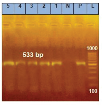 Fig. 1. Amplicons of B. cereus isolates on agarose gel using groEL (533 bp). Lane (1–5) B. cereus isolates, and Lane (L) DNA ladder 100 bp molecular weight marker.