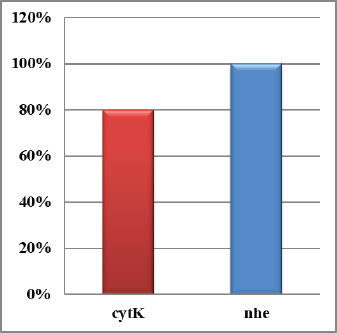 After biochemical identification of B. cereus strains isolated from all examined samples, some isolates (five isolates) were subjected to molecular identification for more confirmation (Fig. 1). The incidence of toxigenic genes in these confirmed isolates have been examined and it was found that B. cereus harbored more than one toxigenic gene. The nhe gene was detected in all of the examined isolates (100%), followed by cytK gene (80%), while hbl and ces genes could not be found (Table 3 and Fig. 2). Also Figure 3 showed that there is a great relationship between hemolytic activities of B. cereus isolates obtained from examined samples and the obtained toxigenic genes.