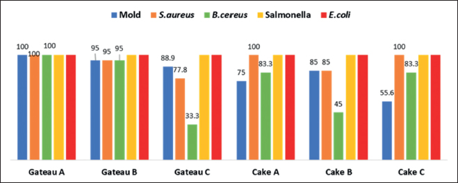 According to the Egyptian Standard specifications for cake (ES: 4037/2020) the higher acceptability degree was reported for the international brand gateau (100% for all parameters) and cake “Tourta” samples (100% for all parameters, except for mold 75% and B. cereus 83.33%).