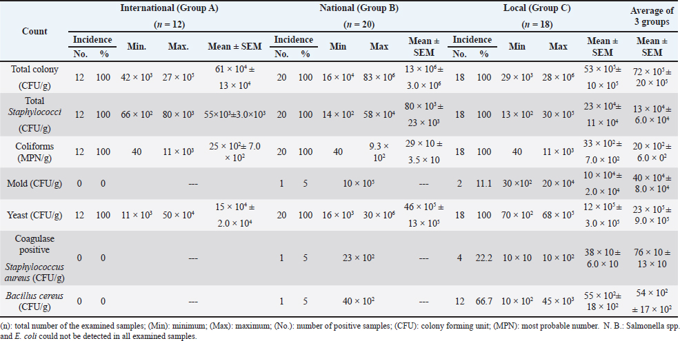 Although Jay (2000) noted that cakes of all types rarely undergo bacterial spoilage due to their unusually high concentrations of sugars, which restrict the availability of water, this state was not the same in the case of cream-based cake samples as shown in Table 2. Results for cream-based cake samples “Tourta” from the international brand were shocking; as it showed the highest mean values for the total colony, mold, and yeast counts 76 × 105 ± 33 × 105; 97 × 103± 14 × 103 and 47 × 104 ± 7.0 × 104 CFU/g, respectively. While on the other side, samples from national brands showed better quality between brands with the lowest values for different examined organisms (Table 2).