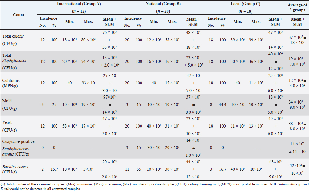 For determining the microbiological quality, samples were analyzed for total colony count according to (ISO, 4833-1: 2013) on Standard plate count agar medium and total yeast and mold count (ISO, 21527-1: 2008) on Sabaroud agar medium, Coliforms count using three tubes method (MPN/g) using Lauryl Sulphate broth, total Staphylococci count, S. aureus on Baired Parker agar and B. cereus counts on MYP medium using spreading technique were done according to APHA (2015).