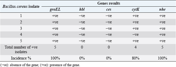Table 3. Molecular identification and incidence of toxigenic genes in 5 B. cereus isolates isolated from the examined samples.