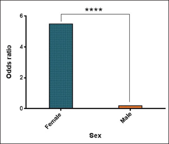 Fig. 5. Results of odds ratio in different sex groups. Concerning age, we found that there was an increase in the prevalence of B. burgdorferi in dogs aged £4 and 5–12 months when compared to older age groups, indicating that younger dogs are more susceptible to B. burgdorferi infection than older ones. Skotarczak et al. (2005) reported that the highest percentage of positive dogs was in groups of 2–5 and 5–8 years old, while the lowest was in groups of 0.5–1.5 and >8 years old. Several authors demonstrated that the threshold for dogs developing a stable immune response is their age over 1 year (Stefancikova et al., 1996; Merino et al., 2000). Other researchers indicate that seropositive response in dogs stabilizes itself from their second year of life (Schulze et al., 1987; Lindenmayer et al., 1991; Hovius et al., 1999; Goossens et al., 2001). In contrast, Mosallanejad et al. (2015) showed that seropositivity against B. burgdorferi was significantly higher in adult dogs above 5 years compared with dogs 1–5 years and <1-year old while, Jung et al. (2012) revealed a lack of significant variation between different age groups (<2, 2–5 and >5 years old). We observed female stray dogs have a higher infection rate and relative risk than males, which might be caused by the greater exposure of females to ticks and pathogens, physiological burden due to pregnancy and suckling (stress factor), and larger sample size of females than males (Bowman et al., 2009). According to many reports, sex factors do not have an effect on the frequency of disease in dogs infected naturally with B. burgdorferi (Stefancikova et al., 1996; Jung et al., 2012; Merino et al., 2000; Skotarczak et al., 2003). In contrast, Mosallanejad et al. (2015) showed that seropositivity against B. burgdorferi was significantly higher in male dogs than in females, significantly. ConclusionTo the best of our knowledge, this represents the first Iraqi study on the prevalence of spirochetes, in particular B. burgdorferi, in stray dogs in Nineveh province (Iraq). However, additional studies of B. burgdorferi infection in other animals and vectors, such as ticks in different geographic areas, appear necessary to detect variation in the distribution patterns of infection. In addition, owners and veterinarians should be aware of zoonotic diseases transmitted from wild and domestic animals, in particular those with tick-bite histories. AcknowledgmentsThe authors have appreciated all the facilities provided by the College of Veterinary Medicine at the University of Mosul (Nineveh province, Iraq) to complete this study. Authors contributionsBoth authors contributed to conceptualization. Eva Aisser Ajaj and Zahraa Mustafa Al-Jumaa: Collection of blood samples, molecular testing of blood samples, and statistical analysis of data with approval of the final copy of the manuscript. Conflict of interestThe authors declare no conflicts of interest. FundingThe authors have not received any funds for this work. Data availabilityAll data is available in this manuscript. ReferencesAdaszek, L., Gatellet, M., Mazurek, P., Debiak, P., Skrzypczak, M. and Winiarczyk, S. 2020. Myocarditis secondary to Borrelia infection in a dog: a case report. Ann. Parasitol. 66(2), 255–257. Altug, N., Muz, M.N., Dilek, M. and Yipel, F.A. 2022. The molecular prevalence of Borrelia burgdorferi, Babesia spp., and Anaplasma spp. In shelter dogs of the Thrace Region in Turkey. Turk. J. Vet. Anim. Sci. 46(3), 14. Ameen, K.A.H., Abdullah, B.A. and Abdul-Razaq, R.A. 2013. Lyme disease in Iraq: first detection of IgM antibodies to Borrelia burgdorferi in human sera. J. Life. Sci. 7(11), 1143–1146. Amusategui, I., Tesouro, M.A., Kakoma, I. and Sainz, Á. 2008. Serological reactivity to Ehrlichia canis, Anaplasmaphagocytophilum, Neorickettsiaristicii, Borrelia burgdorferi, and Rickettsia conorii in dogs from northwestern Spain. Vector. Borne. Zoonotic. Dis. 8(6), 797–804. Angelov, L., Arnaudov, D., Rakajieva, T. and Kostova, E. 1993. Studies of epizootiological process with lyme borreliosis in Bulgaria. Eur. J. Epidemiol. 5, 12–14. Anthony, N.E., Blackwell, J., Ahrens, W., Lovell, R. and Scobey, M.W. 2013. Intestinal spirochetosis: an Enigmatic disease. Dig. Dis. Sci. 58(1), 202–208. Arashima, Y. 1991. Anti-Borrelia burgdorferi antibody in dogs: lyme disease as zoonosis. Rinshobyori. Jpn. J. Clin. Pathol. 39(8), 869–874. Bajer, A., Kowalec, M., Levytska, V.A., Mierzejewska, E.J., Alsarraf, M., Poliukhovych, V. and Dwużnik-Szarek, D. 2022. Tick-borne pathogens, Babesia spp. and Borrelia burgdorferi sl, in sled and companion dogs from Central and North-Eastern Europe. Pathogens 11(5), 499. Barth, C., Straubinger, R.K., Sauter-Louis, C. and Hartmann, K. 2012. Prevalence of antibodies against Borrelia burgdorferi sensulato and Anaplasmaphagocytophilum and their clinical relevance in dogs in Munich, Germany. Berl. Munch. Tierarztl. Wochenschr. 125(7–8), 337–344. Başbulut, E.A., Gözalan, A., Sönmez, C., Çöplü, N., Körhasan, B., Esen, B. and Ertek, M. 2012. Seroprevalence of Borrelia burgdorferi and tick-borne encephalitis virus in a rural area of Samsun, Turkey. Mikrobiyol. Bul. 46(2), 247–256. Bedoya, F., Beugnet, F., Tobias, E., Garcia-Mendizabal, E., Hay-Parker, S., Montes, N. and Mondaca, E. 2023. Geographical analysis of seroprevalence of Ehrlichia spp., Anaplasma spp., Borrelia burgdorferi and Dirofilariaimmitis, in clinics and dog shelters in different Mexican states. Curr. Res. Parasitol. Vector. Borne. Dis. 3, 100112. Berzina, I. and Matise, I. 2013. Seroprevalence against Borrelia burgdorferi sensulato and occurrence of antibody co-expression with Anaplasma phagocytophilum in dogs in Latvia. Ir. Vet. J. 66, 1–3. Bil-Lula, I., Matuszek, P., Pfeiffer, T. and Woźniak, M. 2015. Lyme borreliosis–the utility of improved real-time PCR assay in the detection of Borrelia burgdorferi infections. Adv. Clin. Exp. Med. 24(4), 663–670. Borys, M.A., K