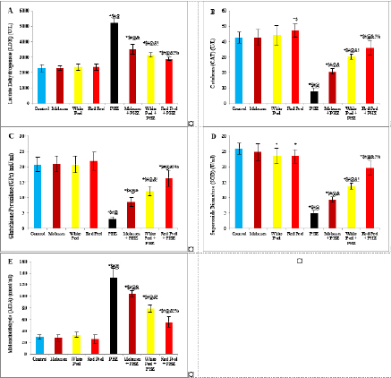 Fig. 2. Effect of oral administration of molasses extract, white peel pomegranate extract, and red peel pomegranate extract to control or PHZ rats both at 25 mg/kg/day for 2 weeks on (A) Lactate Dehydrogenase (LDH) (U/L). (B) CAT (U/L). (C) Glutathione Peroxidase (GPx) (mU/ml). (D) SOD (U/ml). (E) MDA (nmol/ml). Results are expressed as mean ± SEM (n=8 for all groups). * p < 0.05 when compared to the corresponding control values, $ p < 0.05 when compared to the corresponding molasses values, # p < 0.05 when compared to white peel values, [at] p < 0.05 when compared to red peel values, & p < 0.05 when compared to PHZ values, ! p < 0.05 when compared to molasses+PHZ values, % p < 0.05 when compared to white peel+PHZ values; using one-way ANOVA followed by Tukey’s post-hoc test.