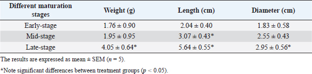 Fig. 4. Bactericidal activity (expressed as a percentage) of okra fruit extract against V. anguillarum depending on different maturity stages. The results are representative of at least three independent experiments and are expressed as mean ± SEM (n =5). (*): Significant differences between treatment groups (p < 0.05). All the antioxidant-tested activities of okra fruits varied depending on their maturity stages. While, the extract showed the highest antioxidant effect at a medium maturity, followed by fruits harvested at the beginning of maturity. While the DPPH radical scavenging activity of okra fruit was significantly lower at the late ripe stage (70.61% ± 0.15%). This result can be connected to the TPC that could be the origin of the antiradical capacity. These data are in correlation with previous results that indicate that several vegetal phenolic compounds are important sources of natural antioxidants (Khomsug et al., 2010). Bactericidal activityThe in vitro evaluation of A. esculentus L. fruits extracts bactericidal effect belonging to three maturity stages was assigned against V. anguillarum, fish pathogenic bacteria (Fig. 4). However, the results demonstrated that the viability of V. anguillarum was influenced by the fruit extract at all the tested stages. Then, as shown in Figure 4, the bactericidal capacity quantitatively varied depending on the maturity stages. Vibrio anguillarum showed a remarkable sensitivity to all okra fruit extracts. Then, the ethanolic extracts at the mid-maturity stage recorded the major inhibitory effect of the bacteria viability. Furthermore, at the three maturity stages the okra fruit extracts have noticeably affected the bacteria growth compared to the control. DiscussionThe length of fresh fruit is considered a major indicator for okra fruit harvest. Generally, the two sizes of okra fruits (small and big) are collected and consumed (Petropoulos et al., 2018). The increase in size and weight indicates an improvement in the quality of okra fruit during maturity (Uchoi et al., 2018). Besides, phenolic elements are considered crucial biomolecules in okra fruits (Hussain et al., 2012). In the same context, Shen et al. (2019) have shown that the main bioactive component in okra fruits is phenolic compounds. Whereas the fruit ripening stage had a marked influence on the secondary metabolite contents extracts. During the ripening of okra, various changes in phenolic level have been established ranging from 37.38 ± 4.22 mg GAE g−1 (late harvested fruits) to 43.27 ± 2.029 mg GAE g−1 (mid-stage maturation of fruits). Similar to our findings, previous research presented a similar level of TPC varied from 33.33 ± 0.02 to 37.38 ± 4.22 mg GAE g−1 (Mohammed et al., 2016). While, previous studies have reported a similar phenolic level in okra fruits (49.72 ± 2.24 mg GAE g−1) (Rohman et al., 2010). Otherwise, another study indicated a lower level of okra fruit phenolic content was indicated (13.456 mg GAE g−1) (Zainuddin et al., 2022). The difference in phenols concentration can also relied on the extraction technique and the polarity of the solvent used (Jing et al., 2015). In addition, these variations are often connected with the difference in geographical origin, the extraction technique used and the experimental protocol adopted (Benchikh et al., 2014). In the current study, the effect of ripening stages on flavonoids level was investigated. The medium stage of maturity reported the most important extractive yield of flavonoids (25.08 ± 0.93 g RE g−1). Our findings are in correlation with Shen et al. (2019) who highlighted the TFC variation of okra fruits during fruit maturity. Literature has explained these results by the dilution effect slowing the biosynthesis of new phenolic compounds which increase the size during ripening for fruits (Anand and Aradhya, 2005). Accordingly, with our results, Mohammed et al. (2016) indicated okra fruit flavonoid contents about 29.979 ± 0.036 mg RE g−1. In addition, similar flavonoid contents of okra fruits have been earlier expressed (31.21 ± 8.64 mg RE g−1) (Rohman et al., 2010). Whereas, Shen et al. (2019) noted that okra fruits flavonoid contents were 10 times lower than ours (2.95 ± 0.06 mg RE g−1). Generally, fluctuations in the reported flavonoid values can arise from several factors like nonrepresentative sampling, different cultivars, and different growing and, analytical conditions (Harnly et al., 2006). Besides, such variations in flavonoid contents might be due to a number of causes as well as genotype, maturity stages, environmental and post-harvest conditions techniques (Koh et al., 2009). In addition, previous research suggested, similarly, that small fruit (3–5 cm) had a higher nutritional value (Petropoulos et al., 2018). The antioxidant activity of A. esculentus L. fruits is correlated with the ripening stage. In that sense, our results showed variation in DPPH value among maturity process from 60.7% ± 0.26% to 75.64% ± 0.79%. Our findings are in accordance with Siddique et al. (2022), which highlighted that Pakistan fruit extract has a scavenging percentage of DPPH radicals around 13.487% lower than the Tunisian one. This fluctuation is caused by the existence of biomolecules such as quercetin and catechin which are more soluble in methanol as a solvent (Wahyuningsih et al., 2020). Numerous further studies have highlighted a directly proportional relationship between phenolic, and flavonoid contents and antioxidant effects of vegetable extracts (Abdel-Hameed, 2009; Shen et al., 2019). In addition, the high antioxidant capacity of okra fruit extract could be explained by its high content of phenolic compounds which function as singlet oxygen quenchers, reduction agents, and hydrogen donors (Reine et al., 2018). Otherwise, as already reported by Uchoi et al. (2018) antioxidant activity can increase depending on the maturation stage of fruits (between the beginning of okra 