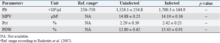 Biochemical comparisonAmong biochemical parameters, blood urea, BUN, and total bilirubin showed significant differences (p < 0.05), while creatinine showed a nonsignificant difference (Table 4). DiscussionBabesia infections in sheep can cause a wide range of clinical and laboratory presentations. Blood parameters are a meaningful manifestation of physiological and pathological changes in an organism. Therefore, the present study was conducted to analyze and compare hematological and biochemical parameters between blood profiles of Lohi sheep naturally infected and uninfected with B. ovis. Leukopenia, a significant decrease in total TLC with a marked decrease in GRAs and LYMs, but an increase in MONs observed in infected animals are in partial agreement with Sevinc et al. (2013) who found leukopenia with decreased GRA and LYM in infected sheep with very high parasitemia in all infected sheep. An increase in MON was found in sheep with low and moderate parasitemia that gradually declined in sheep with a high parasitemic load. The difference probably resulted from infection of animals with different subspecies of B. ovis (Esmaeilnejad et al., 2012a). Monocytosis, i.e., increase in MON is also consistent with the findings of Esmaeilnejad et al. (2012a) who observed monocytosis in ovine babesiosis, and Wright et al. (1998) who reported similar results in bovine babesiosis. El-Sifi et al. (1990) suggested a response of monocytosis as the body’s defense against infection. The marked elevation in the number of MON in Babesia infection is due to their role as active mediators in the natural, innate, nonspecific immune response that involves the activation of macrophages (Court et al., 2001). A protective role is known for macrophages during infection by several Babesia species (Homer et al., 2000). Adejinmi et al. (2004) found a similar reduced TLC response in West African Dwarf sheep infected with Babesia sp. Rahbari et al. (2008) also observed a significant decrease in the TLCs; however, the LYM count was higher than normal. Present findings of a significant decrease in Hb, Hct., and total RBC in B. ovis infected sheep clearly indicated “hemolytic anemia” as previously described in ovine babesiosis by Kozat et al. (2003), Adejinmi et al. (2004), Bicek et al. (2005), Rahbari et al. (2008), Rashid et al. (2010), Sulaiman et al. (2010), Esmaeilnejad et al. (2012a, 2012b), Ijaz et al. (2013), Sevinc et al. (2013), Esmaeilnejad et al. (2014), and Orunç-Kilinç et al. (2015). Statistically significant low values observed Hb, Hct., and total RBC were expected because Babesia destroys erythrocytes (Sevinc et al., 2013). Numerous mechanisms link infection and hemolysis (Berkowitz, 1991) that may be extravascular mediated by the mononuclear phagocytic system, or intravascular. Babesia causes extravascular hemolysis by direct invasion of RBCs and membrane alteration. Cellular invasion and metabolic activity of the parasite alter the cell membrane, leading to splenic sequestration (Dhaliwal et al., 2004). MCV and MCHC are the necessary investigations to codify anemia on a morphological basis (Wiwanitkit, 2007). In this study, the MCV was slightly higher, and the MCHC was lower than in healthy animals, although both were within the reference ranges described by Radostits et al. (2007). Increased MCV (macrocytosis) and low MCHC (hypochromia) are due to reticulocytosis (Latimer, 2011) in which reticulocytes are large, young, and anucleate that lack their full concentration of Hb. Reticulocytosis causes an increase in red cell distribution width-RDW (Brockus, 2011), which is in accordance with present findings and leads to the conclusion that it is “macrocytic hypochromic anemia.” Hypochromic macrocytes indicate either dyserythropoiesis or an increased percentage of reticulocytes (Bain, 2006). Macrocytic hypochromic anemia may be classified as reticulocytosis with regenerative anemia as the classification systems overlap (Tvedten, 2010). The type of anemia may vary in Babesia infection (Kaur, 2014). Rahbari et al. (2008), Sulaiman et al. (2010), and Esmaeilnejad et al. (2012a) described ovine babesiosis associated with microcytic hypochromic anemia. Table 3. Means (±standard error) of Plt, MPV, Pct, and PDW in B. ovis-infected Lohi sheep compared to uninfected.