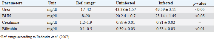 Table 4. Means (±standard error) of urea, BUN, creatinine, and bilirubin in B. ovis-infected Lohi sheep compared to uninfected.