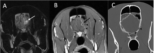 Fig. 5. (A) Transverse T2-weighted, (B) transverse post-contrast T1-weighted image, and (C) dorsal post-contrast T1-weighted image obtained 6 months after surgery. Note the absence of any contrast enhancement and residual lesion connecting the lateral ventricle (arrows). Also, note the defect in the presphenoid bone (arrowheads in C). The administration of anti-inflammatory doses of corticosteroids together with antimicrobials is associated with a better outcome (fewer sequelae and mortality) in human patients with bacterial meningoencephalitis (van de Beek et al., 2004). Corticosteroids may reduce adverse effects produced during antibiotic-induced bacterial lysis. Endotoxins, peptidoglycans, and fragments of the cell wall can release pro-inflammatory cytokines that can induce profound meningeal inflammation and brain edema (Nau et al., 1998). The timing of administration is critical to prevent the release of inflammatory mediators secondary to bacterial lysis. In humans, doses of dexamethasone (0.1–0.15 mg/kg, IV, q4 hours, for 2–4 days) are recommended before, or at the same time, as the first dose of antimicrobials (van de Beek et al., 2004). However, its usefulness in patients with abscesses of bacterial origin has not been demonstrated with higher rates of mortality and morbidity (Nau et al., 1998; Hakan et al., 2006; Lu et al., 2006). All the previously described cases of dogs with brain abscess or granuloma associated with plant foreign body were diagnosed postmortem (Burgisser and Hintermann, 1967; McCandlish and Ormerod, 1978; Dennis et al., 2005; Mateo et al., 2007). A poor prognosis has also been associated with bacterial meningoencephalitis (Radaelli and Platt, 2002). However, cases (dogs and cats) with brain abscesses due to bites or extension of otogenic infections seem to have a much more favorable prognosis, particularly after surgical treatment (Bilderback and Faissler, 2009; Costanzo et al., 2011). Surgery has been advised in patients with increased intracranial pressure due to the mass effect, or when sample collection is required for microbiological study (Bilderback and Faissler, 2009; Costanzo et al., 2011). Surgery will also allow drainage of the lesion and collection of samples for culture, thus guiding the most appropriate antibiotic regimen. Nevertheless, the effect of surgery on prognosis has not been established. This case represents the only case in which long term (6 months) radiological follow-up of the lesion was carried out by means of MRI, proving the disappearance of the lesion. The seizures that the patient had during the rest of its life were probably due to epileptogenic focus in the cerebral parenchyma where the abscess was located. In conclusion, we can highlight the typical radiological features of brain abscesses consisting of an intra-axial lesion with intense ring enhancement (both in CT and MRI). If an extracranial abnormality is found in adjacent tissues, the diagnosis of a cerebral abscess is almost definitive. Surgical treatment that allows decompression, drainage, lavaging, and collection of samples for cytological and microbiological examination should be considered in patients with brain abscesses. ReferencesBentley, R.T., Faissler, D. and Sutherland-Smith, J. 2011. Successful management of an intracranial phaeohyphomycotic fungal granuloma in a dog. J. Am. Vet. Med. Assoc. 239, 480–485. Bentley, R.T., Heng, H.G., Thompson, C., Lee, C.S., Kroll, R.A., Roy, M.E., Marini, L., Heo, J. and Wigle, W.L. 2015. Magnetic resonance imaging features and outcome for solitary central nervous system coccidioides granulomas in 11 dogs and cats. Vet. Radiol. Ultrasound 56, 520–530. Bilderback, A.L. and Faissler, D. 2009. Surgical management of a canine intracranial abscess due to a bite wound. J. Vet. Emerg. Crit. Care 19, 507–512. Brennan, K.E. and Ihrke, P.J. 1983. Grass awn migration in dogs and cats: a retrospective study of 182 cases. J. Am. Vet. Med. Assoc. 182, 1201–1204. Burgisser, H. and Hintermann, J. 1967. Cerebral damages due to foreign bodies from the nasal cavity in the dog. Schweiz. Arch. Tierheilkd. 10, 537–538. Costanzo, C., Garosi, L.S., Glass, E.N., Rusbridge, C., Stalin, C.E. and Volk, H.A. 2011. Brain abscess in seven cats due to a bite wound: MRI findings, surgical management and outcome. J. Feline Med. Surg. 13, 672–680. Dennis, M.M., Pearce, L.K., Norrdin, R.W. and Ehrhart, E.J. 2005. Bacterial Meningoencephalitis and ventriculitis due to migrating plant foreign bodies in three dogs. Vet. Pathol. 42, 840–844. Hagan, R.E. 1971. Early complications following penetrating wounds of the brain. J. Neurosurg. 34, 132–141. Hakan, T., Ceran, N., Erdem, I., Berkman, M.Z. and Göktaş, P. 2006. Bacterial brain abscesses: an evaluation of 96 cases. J. Infect. 52, 359–366. Klopp, L.S., Hathcock, J.T. and Sorjonen, D.C. 2000. Magnetic resonance imaging features of brain stem abscessation in two cats. Vet. Radiol. Ultrasound 41, 300–307. Lu, C.H., Chang, W.N. and Lui, C.C. 2006. Strategies for the management of bacterial brain abscess. J. Clin. Neurosci. 13, 979–985. Mateo, I., Lorenzo, V., Muñoz, A. and Pumarola, M. 2007. Brainstem abscess due to plant foreign body in a dog. J. Vet. Intern. Med. 21, 535–538. McCandlish, I.A.P. and Ormerod, E.J. 1978. Brain abscess associated with a penetrating foreign body. Vet. Rec. 102, 380–381. Miller, C.F., Brodkey, J.S. and Colombi, B.J. 1977. The danger of intracranial wood. Surg. Neurol. 7, 95–103. Nau, R., Sörgel, F. and Prange, H.W. 1998. Pharmacokinetic optimization of the treatment of bacterial central nervous system infections. Clin. Pharmacokinet. 35, 223–246. Radaelli, S.T. and Platt, S.R. 2002. Bacterial meningoencephalomyelitis in dogs: a retrospective study of 23 cases (1990–1999). J. Vet. Intern. Med. 16, 159–163. Seiler, G., Cizinauskas, S., Scheidegger, J. and Lang, J. 2001. Low-field magnetic resonance imaging of a pyocephalus and a suspected brain a