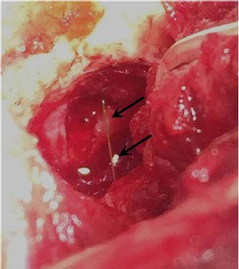 Fig. 3. Intraoperative view after left rostrotentorial craniectomy and durotomy above the orbital fissure. Note durectomy and the presence of a grass awn (arrows) overlying brain parenchyma once extracted from the frontal lobe. DiscussionMost of the brain abscesses diagnosed in veterinary literature are produced by direct extension of extracranial infections such as otitis media/interna, rhinitis, exposed trauma, or foreign body migration (Burgisser and Hintermann, 1967; McCandlish and Ormerod, 1978; Klopp et al., 2000; Seiler et al., 2001; Dennis et al., 2005; Sturges et al., 2006; Mateo et al., 2007; Bilderback and Faissler, 2009; Costanzo et al., 2011). MRI and CT are very effective methods for the detection of brain abscesses in both dogs and cats (Thomas, 1999). Classic MRI findings consist of the presence of a ring enhanced lesion with a hypointense central area in T1W images and hyperintense in T2W images associated with perilesional edema and variable mass effect (Thomas, 1999; Klopp et al., 2000; Costanzo et al., 2011). An inflammatory granuloma associated with plant material has also been described in the brainstem of a dog (Mateo et al., 2007). The CT findings consist of a hypoattenuating lesion surrounded by an intense and ring-shaped enhancement (Bilderback and Faissler, 2009). These findings, both MRI and CT, are not specific. With such findings, differential diagnoses must include neoplastic and vascular (hemorrhagic infarction) diseases. However, when inflammatory changes in extra-cranial tissue are observed, differential diagnosis narrows; with infectious dissemination being almost the only possibility (Klopp et al., 2000; Sturges et al., 2006, Bilderback and Faissler, 2009; Costanzo et al., 2011). For this reason, when a lesion with these described features is observed, an attempt should be made to identify changes in adjacent tissue which would suggest foreign body migration or dissemination of an infectious process rather than glioma or hemorrhage. The case presented here did not reveal any previous history of ocular or oral disease nor any clinical sign suggestive of extracranial involvement. In human medicine, brain abscesses usually occur a few days after the entry of the infectious agent into the CNS; however, there is considerable variation (Hakan et al., 2006). Moreover, not all materials have the same possibility of abscess formation, e.g., wooden foreign bodies cause abscess formation in 48% of cases (Miller et al., 1977) and foreign metallic bodies have a lower frequency for abscess formation (10%–33%). The latter are often hot and sharp at penetration and perhaps produce a relatively sterile wound (Hagan, 1971). In the presence of an infectious process in the CNS, it would be expected to find an increased cell count in CSF, usually neutrophilic pleocytosis, which is the hallmark of bacterial infections of the CNS (Tipold, 1995). However, in this case, the CSF analysis was normal. This could be due to the intra-axial location of the abscess without dissemination on the subarachnoid space. If a cerebral abscess is suspected, a culture of the CSF can be performed. However, a negative result does not exclude a diagnosis, particularly if the patient has been previously treated with antibiotics (Radaelli and Platt, 2002). Antibiotic therapy remains the most important issue in the treatment of intracranial abscesses and should be orientated, ideally, by the results of the microbiological cultures obtained during the surgical procedure (Bilderback and Faissler, 2009; Costanzo et al., 2011). Abscesses are usually caused by aerobic or anaerobic bacteria, but sometimes they can be polymicrobial or fungal (Bentley et al., 2011; 2015). In the absence of positive cultures, some studies in human medicine recommend a combination of broad-spectrum intravenous antimicrobial therapy combining the third-generation cephalosporins (for Gram-positive and Gram-negative), metronidazole (for anaerobes), and ampicillin (to additionally cover other Gram-positive) (Sjölin et al., 1993; Nau et al., 1998; Lu et al., 2006). Usually, intravenous antibiotic therapy is established for 4–8 weeks followed by control CT before starting oral antibiotic treatment (Lu et al., 2006). In the veterinary literature, it has been recommended to maintain intravenous therapy until clinical improvement is observed. Oral medication should be maintained until at least 10–14 days after the resolution of the clinical signs (Bilderback and Faissler, 2009).