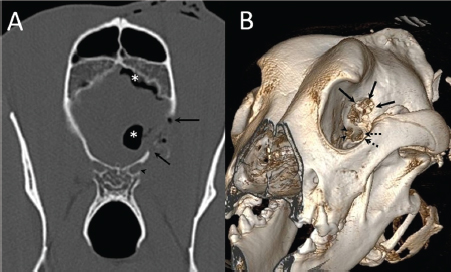 Fig. 4. (A) Transverse and (B) 3D reconstruction postoperative CT images. Note increased defect on the presphenoid bone (arrows) immediately dorsal to the optic canal (arrowhead) and orbital fissure (dotted arrow). Also, note the presence of hypoattenuating content inside and over the dorsal surface of the frontal lobe (asterisks) compatible with air.