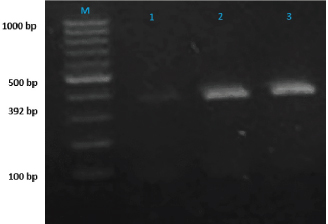 Fig. 1. Lane M shows PCR marker (1,000 base pairs) while Lane1-3 symbolize samples.