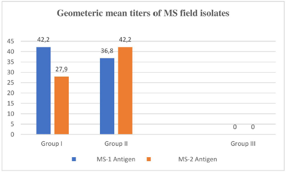 Fig. 3. Geometric mean titers of MS field isolates. Using the molecular method of MS characterization (Multiplex PCR) through the amplification of vlhA gene of MS,found a 25.3% prevalence of MS in Egyptian uninhabited birds. Rasool et al. (2018) also amplified and sequenced the 16 S r RNA (213 bp) and vlhA gene (375 bp) to differentiate MS from various field strains. Out of 40 Mycoplasma isolates, 20 (50%) were identified as MS through 16 S r RNA, and five (12.5%) were characterized as MS through fractional vlhA gene analysis. Both MS field isolates (MS-1 and MS-2) showed the same homologous immunogenic titer of (42.2 GMT) as a result of the Haemagglutination Inhibition test. There were some variations in heterologous values. The MS-2 isolate showed a lower (66%) heterologous immune response with MS-1 serum as compared to MS-1 isolate (87%) against MS-2 serum, as indicated in Figure 3. Similar findings were recorded by Weinack and Snoeyenbos (1976), who also elaborated on the immunogenic alterations amongst three stains of MS. The differential study using the haemagglutination inhibition test amongst the field isolates of MS and standard WVU 1853 MS strain was carried out by Vardaman and Drott (1980). Vardaman and Yoder also found increased levels of HI titers in homologous MG and MS antigens than the homologous HI levels (1969). A high level of homologous antigenic cross reactivity as compared to heterologous was also studied in different M. gallisepticum field strains isolated from commercial poultry (broiler) farmhouses in KP (Pakistan) by Rehman et al. (2022). A variety of serological tests were used to explore the existence of antigenic cross reactivity in different isolates of M. pneumoniae and M. genitallium. The study was carried out in the rabbits that were previously immunized with the different isolates of M. pneumoniae and M. genitallium, and antiserum was raised, as documented by Lind et al. (1984). Fakruddin et al. performed various serological techniques on food samples to study the cross reactions in different bacterial species and recorded robust immunological cross reactivity between Enterobacteriaceae and virulent bacteria present in various types of food stuff (2015). Current advancements in the invention of apparatuses and procedures to divine (Agrawal, 2019) cross immunity against various types of microorganisms will be helpful in the production of vaccines. ConclusionThe presence of MS in broiler birds was confirmed by cultural, biochemical, and molecular tests in five districts of KP. The results of the immunological cross-reactivity showed that homologous GMT titers were high in comparison to heterologous GMT titers. Routine monitoring of the pathogen will be helpful to overcome the disease. The most authentic, easy, and reliable technique was PCR assay among all the techniques performed in this study. AcknowledgmentsThe authors would like to express their sincere gratitude to Professor Sajjad Ur Rahman for his invaluable assistance and guidance during the duration of the study. Conflict of interestAll authors declare that there is no conflict of interest. Authors contributionsConceptualization: Sajjad Ur Rahman and Abdul Haleem Shah. Data curation: Atta Ur Rehman Formal analysis Saifur Rehman, Kamal Shah, and Inamullah Malik, Funding acquisition: Widya Paramita Lokapirnasari and Atta Ur Rehman. Investigation: Sajjad Ur Rahman and Atta Ur Rehman. Methodology: Atta Ur Rehman, Sajjad Ur Rahman, and Abdul Haleem Shah. Project administration: Atta Ur Rehman; Imdadullah Khan, and Inamullah Malik Resources: Widya Paramita Lokapirnasari; Software: Atta Ur Rehman and Saifur Rehman Supervision: Sajjad Ur Rahman and Abdul Haleem Shah Validation: Atta Ur Rehman, Abdul Haleem Shah, Sajjad Ur Rahman; Saifur Rehman Muhammad Kamal shah, Widya Paramita Lokapirnasari, Imdadullah Khan, Inamullah Malik and Andreas Berny Yulianto, Writing - original draft: Attaur rehman; Saifur rehman; Writing - review and editing: All authors: FundingThe Faculty of Veterinary Medicine (Fakultas Kedokteran Hewan), Universitas Airlangga, as indicated by document number (769/UN3.14/PT/2020), supported the APC. Data availabilityAdditional data may be obtained from the primary author and corresponding author upon a reasonable request. ReferencesAbbas, N., Muhammad, S., Naveed, M., Rahman, S., Ahmad, K.N., Tariq, N.A., Khalid, A. and Faheem, J. 2018. Seropositivity, involvement in suspected cases of chronic respiratory diseases and comparative efficacy of various sero-diagnostic tests of Mycoplasma gallisepticum. J. Appl. Environ. Biol. Sci. 8(3), 137–141. Agrawal, B. 2019. Heterologous immunity: role in natural and vaccine-induced resistance to infections. Front. Immunol. 10, 2631. Allan, W.H. and Gough, R.E. 1974. A standard haemagglutination inhibition test for newcastle disease. (1). A comparison of macro and micro methods. Vet. Rec. 95(6), 120–123. Amer, M.M., Mekky, H.M., & Fedawy, H.S. 2019. Molecular identification of Mycoplasma synoviae from breeder chicken flock showing arthritis in Egypt. Vet. World 12(4), 535–541. Beylefeld, A. 2018. Genomic comparison of mycoplasma species isolated from commercial chickens in South Africa (Doctoral dissertation, University of Pretoria). Buim, M.R., Mettifogo, E., Timenetsky, J., Kleven, S. and Ferreira, A.J.P. 2009. Epidemiological survey on Mycoplasma gallisepticum and M. synoviae by multiplex PCR in commercial poultry. Brazil J. Vet. Res. 29, 552–556. Cheng, X., He, W., Huang, F., Huang, M. and Zhou, G., 2014. Multiplex real-time PCR for the identification and quantification of DNA from duck, pig and chicken in Chinese blood curds. Food Res. Int. 60, 30–37. Dhondt, A.A., Dhondt, K.V., Hawley, D.M. and Jennelle, C.S. 2007. Experimental evidence for transmission of Mycoplasma gallisepticum in house finches by fomites. Avian Pathol. 36(3), 205–208. Diene, S.M., Bertelli, C., Pillonel, T., Jacquier, N., Croxatto, A., Jaton, K. and Greub, G. 2016. C