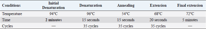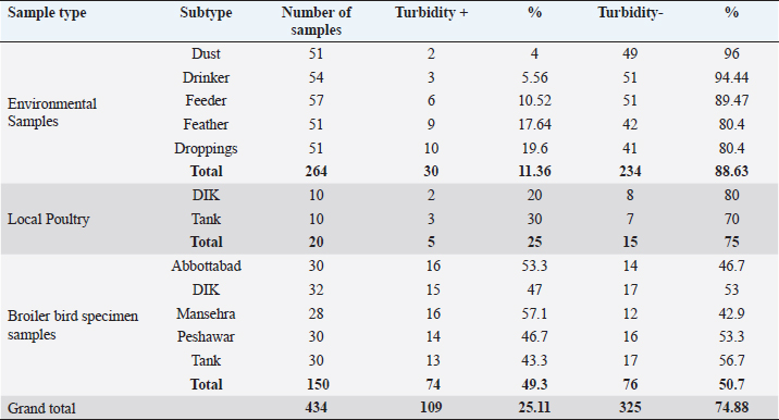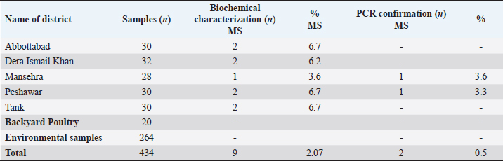 AbstractBackground: Mycoplasma synoviae (MS) is an important poultry pathogen causing heavy economic losses Worldwide. Subclinical persistence of this pathogen is the major issue to control its prevalence. Aim: This study aimed to determine the molecular and cross-immunogenicity of MS among broilers in five Districts of Khyber Pakhtunkhwa (KP). Methods: This study was conducted by collecting 434 specimen samples from 40 broiler farms and desi poultry in five districts of KP. Specimen samples from the broiler birds (n=150), broiler farm environment (n=264), and desi poultry birds (n=20) were aseptically collected and serially passaged in Modified Frey’s broth. The homologous and heterologous antibody reactions were studied in rabbits. Before inoculation into rabbits, the MS isolates were inactivated by formalin and adjuvanted with Montanide. Results: The overall turbidity prevalence in Frey’s broth was observed as 109/434 (25.11%) samples, and these turbidity-positive samples were shifted on Frey’s agar. After the appearance of classic fried egg colonies, the Biochemical confirmation was supported by the production of catalase and phosphatase, reduction of tetrazolium, film and spot assay, and fermentation of glucose for species differentiation in avian mycoplasma. The MS prevalence percentage was recorded as 2% (9/434) through biochemical tests. The PCR results showed 0.5% MS prevalence with two field isolates (named MS-1 and MS-2). Both MS-1 and MS-2 field isolates showed similar values (42.2) of homologous geometric mean titer (GMT). While the heterologous GMT for MS-1 serum against MS-2 isolate was lower (27.9) as compared to MS-2 serum against MS1 isolate (38.9). No titer was detected in the control group (Group-III). Conclusion: In conclusion, the results indicated the existence of MS in broiler birds and high homologous titers recorded between field isolates, which is a perpetual menace to poultry. Keywords: Mycoplasma synoviae, PCR characterization, Homologous and heterologous antigenic responses. IntroductionGenus Mycoplasma contains a lot of vital poultry pathogens, which are responsible for heavy economic losses all over the World (Dufour-Gesbert et al., 2006). Among these avian Mycoplasma spp: Mycoplasma synoviae (MS) and Mycoplasma gallisepticum are known as the worst of all the avian species (Buim et al., 2009). MS is a wall-less bacteria having a high number of sterols in the cell membrane (Kleven, 2008). MS has the smallest genome with 23%–40% G+C contents (Nicholas and Ayling, 2003). The main target of MS is the nose, throat, pharynx, trachea, and bronchi, resulting in subclinical upper respiratory disease. When MS is accompanied by MG, it causes air sacculitis (Silva et al., 2008). Horizontal as well as vertical modes of transmission are found in MS. From infected birds, MS can easily be transferred through aerosols generated by diseased birds. Direct contact as well as contaminated fomites can also be a source of infection (Marois et al., 2005). Immunocompromised birds are more affected by MS (Dhondt et al., 2007). Infectious synovitis, respiratory sickness, lowered egg yield, miss shaped eggs, and slow weight gain are the main clinical infections caused by MS. Death rates are very low due to these infections, but their economic impact is long-lasting in the poultry birds all over the Globe (Kursa et al., 2019). Less effectivity of many antibiotics against various Mycoplasma spp: has increased the interest in the prevention of the diseases caused by these bacteria. However, very few effective vaccines against mycoplasma are available to provide long-lasting immunity (Nicholas and Ayling, 2003). The production of more efficient vaccines is mandatory to control the diseases caused by avian mycoplasma. The variations in the antigenicity were witnessed in many species of mycoplasma (Wise, 1993) as documented by 2 (Lin and Kleven, 1982) in MG strains. Virulence of these MG isolates is also associated with antigenicity (Lin and Kleven, 1982). Homologous and heterologous titers were studied by Vardaman and Yoder (1969) using HI antigens (M. gallisepticum and MS). The researchers found higher homologous HI titers than the heterologous titers. Rehman et al. (2022) also found high homologous GMT values among M. gallisepticum field isolates in KP (Rehman et al., 2022). Quick and timely diagnosis of MS is imperative to avert MS spread to minimize the economic losses in commercial broilers. There are three approaches to diagnose mycoplasma infection: identification and isolation of the bacterium by culture recognition of its DNA. Serological methods like ELISA, serum plate agglutination test, and Haemagglutination inhibition tests (Dufour-Gesbert et al., 2006; Abbas et al., 2018) are used to detect the specific antibodies. VlhA gene was found more satisfactory in MS strain differentiation (Beylefeld, 2018). Hemagglutinin and pro-lipoprotein are present on VlhA gene (Dijkman et al., 2014). The antigenic and phase differentiation are expressed by hemagglutinin (Matucci et al., 2020). The precise and fast characterization of MS is mostly based on the amplification (Diene et al., 2016) of the conserved region of the vlhA gene using the most familiar conventional PCR-based technique. Due to a lack of applicable written data about MS isolation, PCR conformation, and antigenic cross immunity in various districts of Khyber Pakhtunkhwa (KP), the current study was planned to characterize MS isolates through various tools, including PCR. Materials and MethodsA total of 434 specimens as well as environmental samples, were collected for an unknown population with a 95% confidence interval from the forty commercial poultry (broiler) farmhouses of various localities (districts) of KP. Eight (n=8) closed sheds were selected from Abbottabad and Mansehra 4 from each district. Thirty-two (n=32) open broiler sheds were nominated from D.I. Khan, Peshawar, and Tank as 12, 10, and 10, respectively