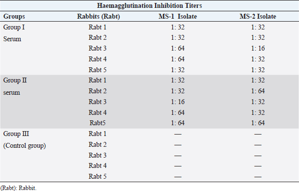 Fig. 2. MS with extreme resemblance by Phylogenetic study using Mega XI software (neighbor joining). Table 5. The Haemagglutination inhibition titers documented among the MS field strains in rabbits.