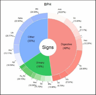 Fig. 1. Percentage of each sign (digestive, urinary, and others) affected and associated clinical signs for BPH. Clinical signs: Ano: anorexia; Co: constipation; Di: diarrhea; Hec: hematochezia; Te: tenesmus; Vo: vomiting; Wl: weight loss Bfu: blood dripping from the urethra; Dy: dysuria; Heu: hematuria; Pu_Po: polyuria/polydipsia; Ap: abdominal pain from palpation; Hlw: hind limb weakness; Lth: lethargy; PeHe: perineal hernia; and PPr: prostatomegaly or pain when rectal examination. The line without signs (-) indicates clinical signs that are not included because they appear in less than 5%.
