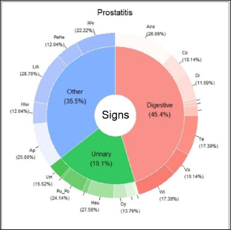 In the case of prostatitis (Fig. 2), the frequency of signs categories was similar (digestive signs, other signs, and urinary signs, respectively), but there were variations in the prevalence within each category. Of the digestive signs, anorexia became the most frequent, followed by tenesmus and weight loss. Lethargy and abdominal pain from palpation were the most frequently seen in the category of “other signs,” followed by prostatomegaly or pain during the rectal examination.