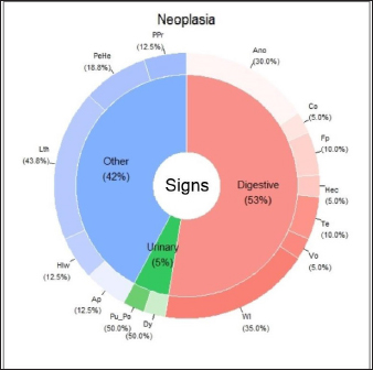Fig. 3. Percentage of each sign (digestive, urinary, and other) affected and associated clinical signs for the PN. clinical signs: Ano: anorexia; Co: constipation; Fp: flat stools; Hec: hematochezia; Te: tenesmus; Vo: vomiting; Wl: weight loss; Dy: dysuria; Pu_Po: polyuria/polydipsia; Ap: abdominal pain from palpation; Hlw: hind limb weakness; Lth: lethargy; PeHe: perineal hernia; and PPr: prostatomegaly or pain when rectal examination.