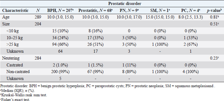 Table 1. Prostatic disorders (BPH, prostatitis, PN, SM, and PC) in canines from the retrospective study (2011–2019) according to age, size (<10 kg; ≥10 and ≤25 kg; and >25 kg), and neutering (castrated/non-castrated).