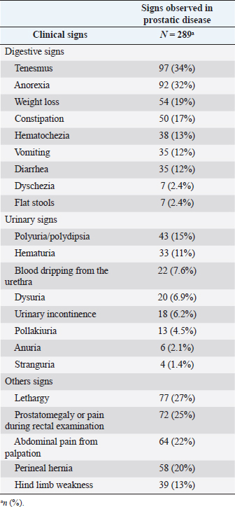 Methods: This retrospective study included 7,729 male canines treated at the hospital de la Facultad de Veterinaria–Universidad de la República (Montevideo, Uruguay) between 2011 and 2019. 289 canines with a presumptive/definitive diagnosis of prostate diseases were selected, recording the presence/absence of associated clinical signs. Results were reported in terms of odds ratios (ORs) using logistic regression (p < 0.05).