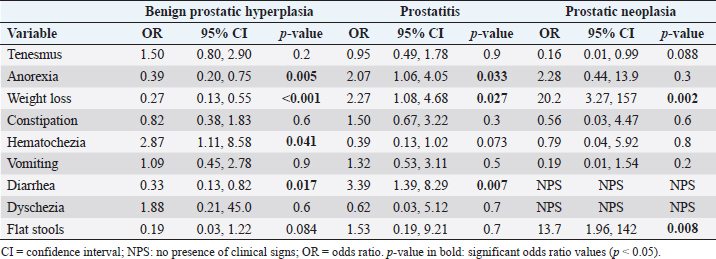 Results: The five most frequently reported clinical signs were tenesmus (34%), anorexia (32%), lethargy (27%), prostatomegaly or pain during rectal examination (25%), and abdominal pain from palpation (22%). Diarrhea (3.39 vs. 0.33 OR), anorexia (2.07 vs. 0.39 OR), weight loss (2.27 vs. 0.27 OR), hematuria (3.25 vs. 0.44 OR), and urinary incontinence (2.96 vs. 0.33 OR) indicated a highest predictive value (p < 0.05) with prostatitis versus BPH, respectively. Being weight loss, the clinical sign is more frequently associated with neoplasia (20.2 OR, p=0.002).