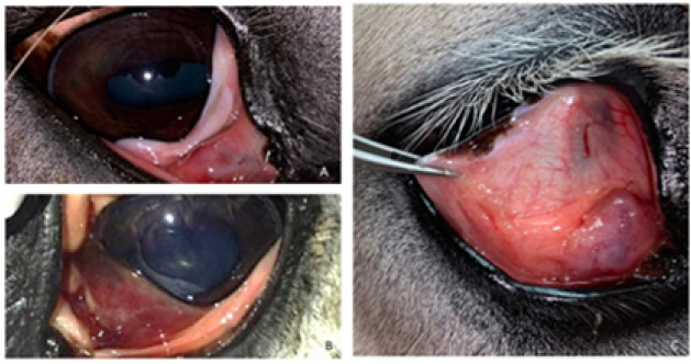 Fig. 2. Bulbar conjunctival haemangiosarcoma gross presentation. (A) Case 2 conjunctival and corneolimbal haemangiosarcoma, (B) Case 6 bulbar conjunctival haemangiosarcoma, (C) Case 5 bulbar conjunctival haemangiosarcoma. Note the exophytic, discrete and lobulated appearance of the tumour. Table 2. Location, surgical procedure performed, and outcome.