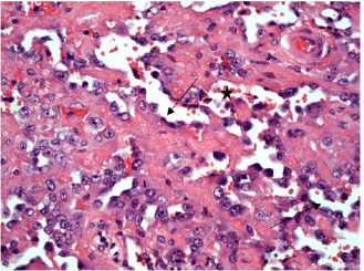 Fig. 3. H&E photomicrograph (400× magnification) of case 1 conjunctival haemangiosarcoma from the third eyelid of a horse. Irregular blood-filled vascular channels (star) formed by the tumour and lined by pleomorphic neoplastic endothelial cells (arrows).